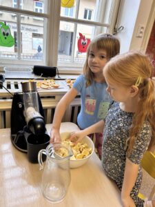 Děti si připravily zdravou a chutnou aktivitu – výrobu čerstvé pomerančové šťávy. Nejprve pomeranče oloupaly a nakrájely na menší kousky, které poté vložily do odšťavňovače.