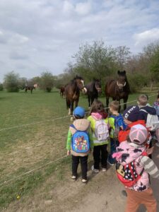 Děti se dnes vydaly na pěší vycházku do obce Pšice, kde jsme v rámci tématu týdne Farma navštívili ohradu s koňmi. Děti měly možnost pozorovat