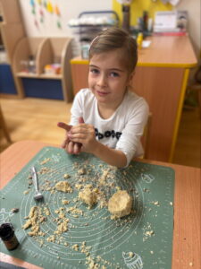 Děti si s radostí hrály s těstem, tvořily malé kuličky a vytvářely z nich sněhuláky. Kuličky společně posypaly a přidaly potravinářské barvivo. Celé tvoření je