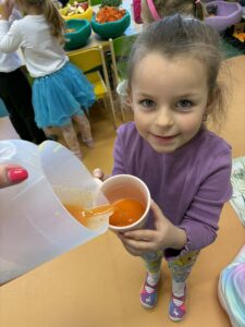 S dětmi experimentujeme tím, že společně krájíme ovoce či zeleninu, děláme pomazánky nebo pečeme dobroty na kterých si společně pochutnáme. Děti do jídla nenutíme, ale motivujeme je k tomu, aby ochutnaly.