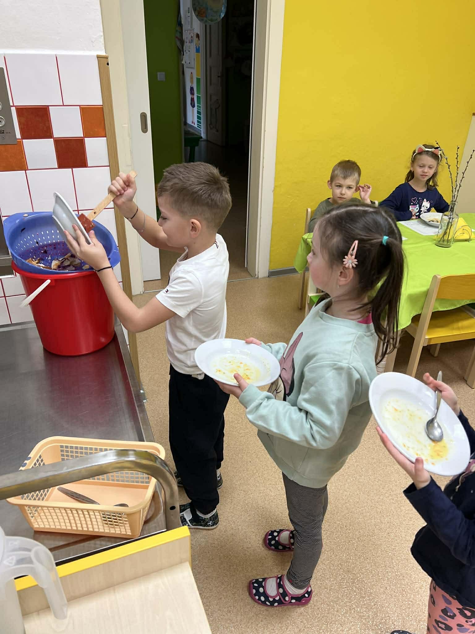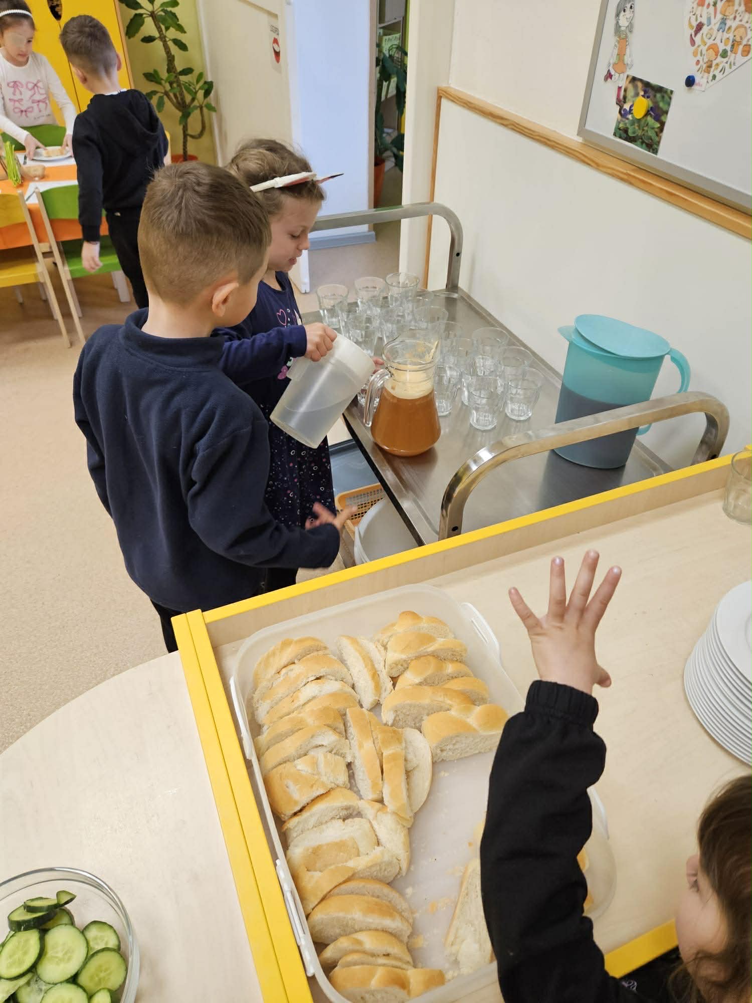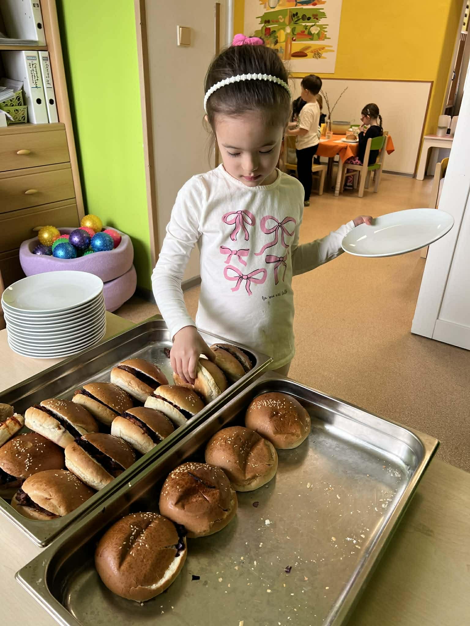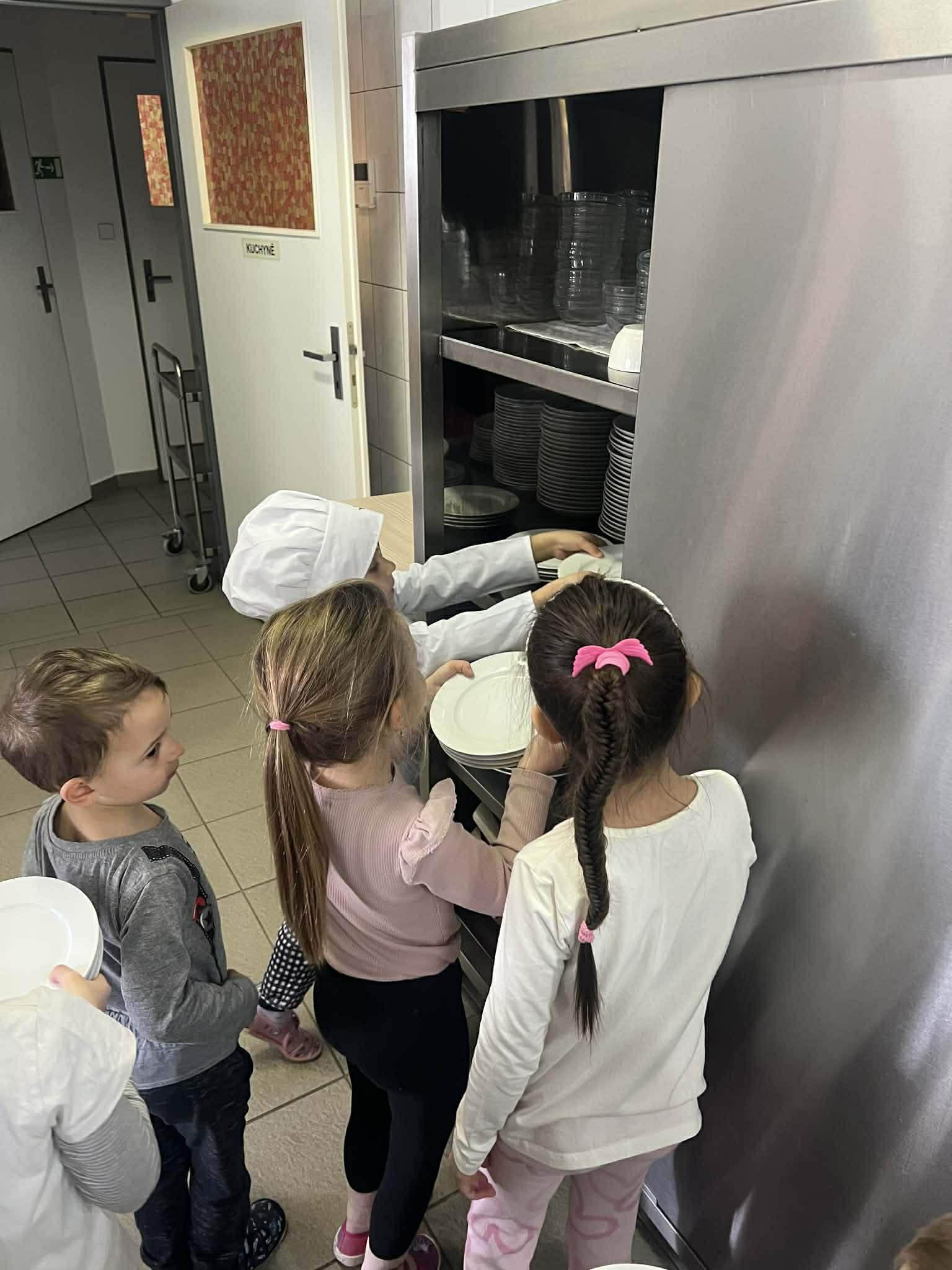 Samostatnost dětí při jídle V naší mateřské škole podporujeme děti v samostatnosti i při přípravě jídla a stolování. Při dopolední svačině si děti vyzkoušely připravit rybičkovou pomazánku. Pomáhaly s jejím mícháním, krájením pletýnek a okurky a zapojily se i do mytí nádobí v kuchyni. Při svačině si mohly zvolit nápoj podle chuti – vodu, čaj nebo jablečnou šťávu ředěnou vodou. Samostatnost rozvíjíme také u oběda. Děti si samy prostírají, polévku si nabírají v množství, které zvládnou sníst, a hlavní jídlo – hamburger s domácí houskou a trhaným kachním masem – si také samy servírují. Po jídle děti stírají zbytky do koše na bioodpad a uklízí své místo. Je vidět, že děti všech věkových kategorií se dokážou obsloužit samy a s radostí se zapojují do každodenních činností.