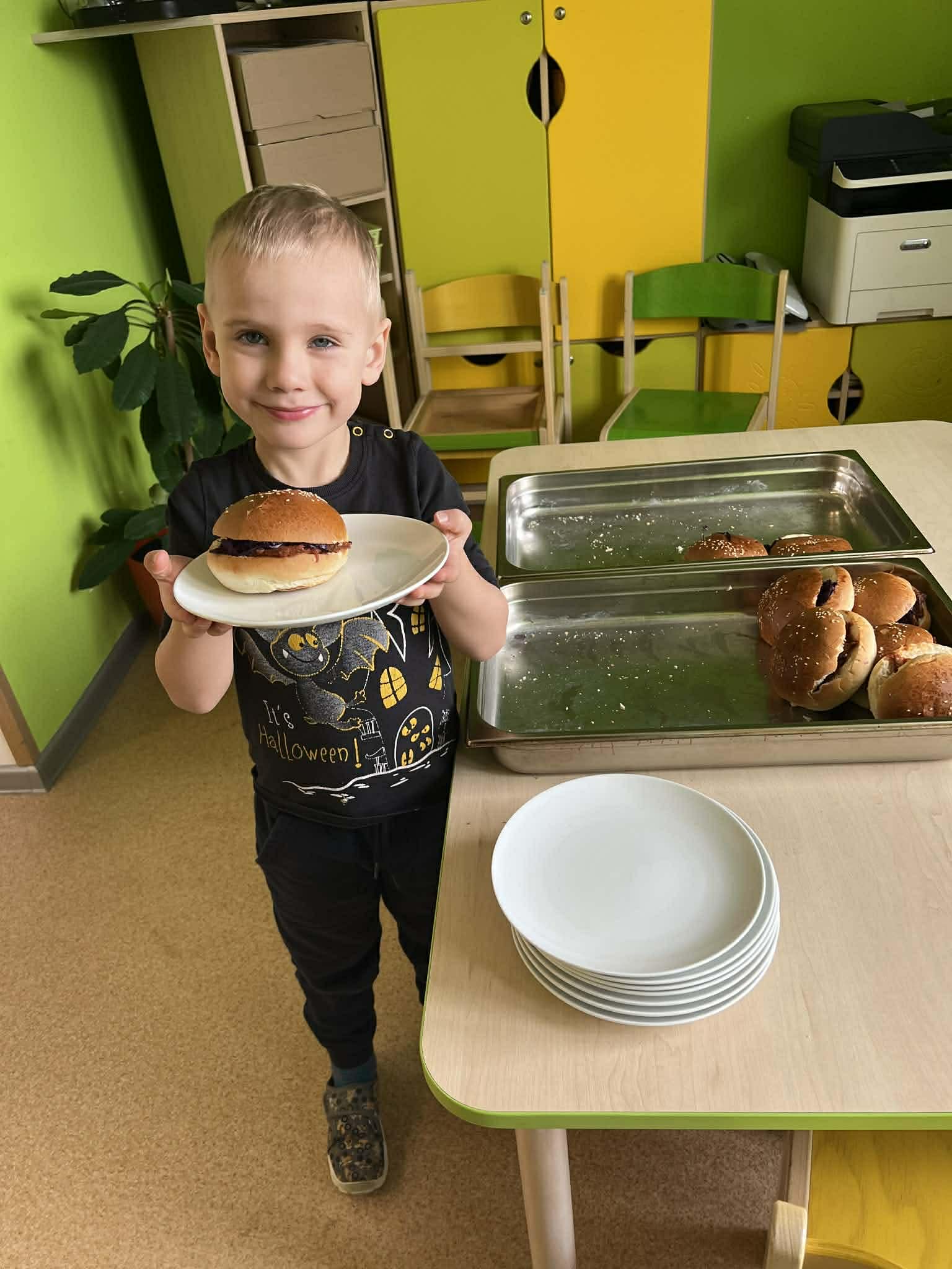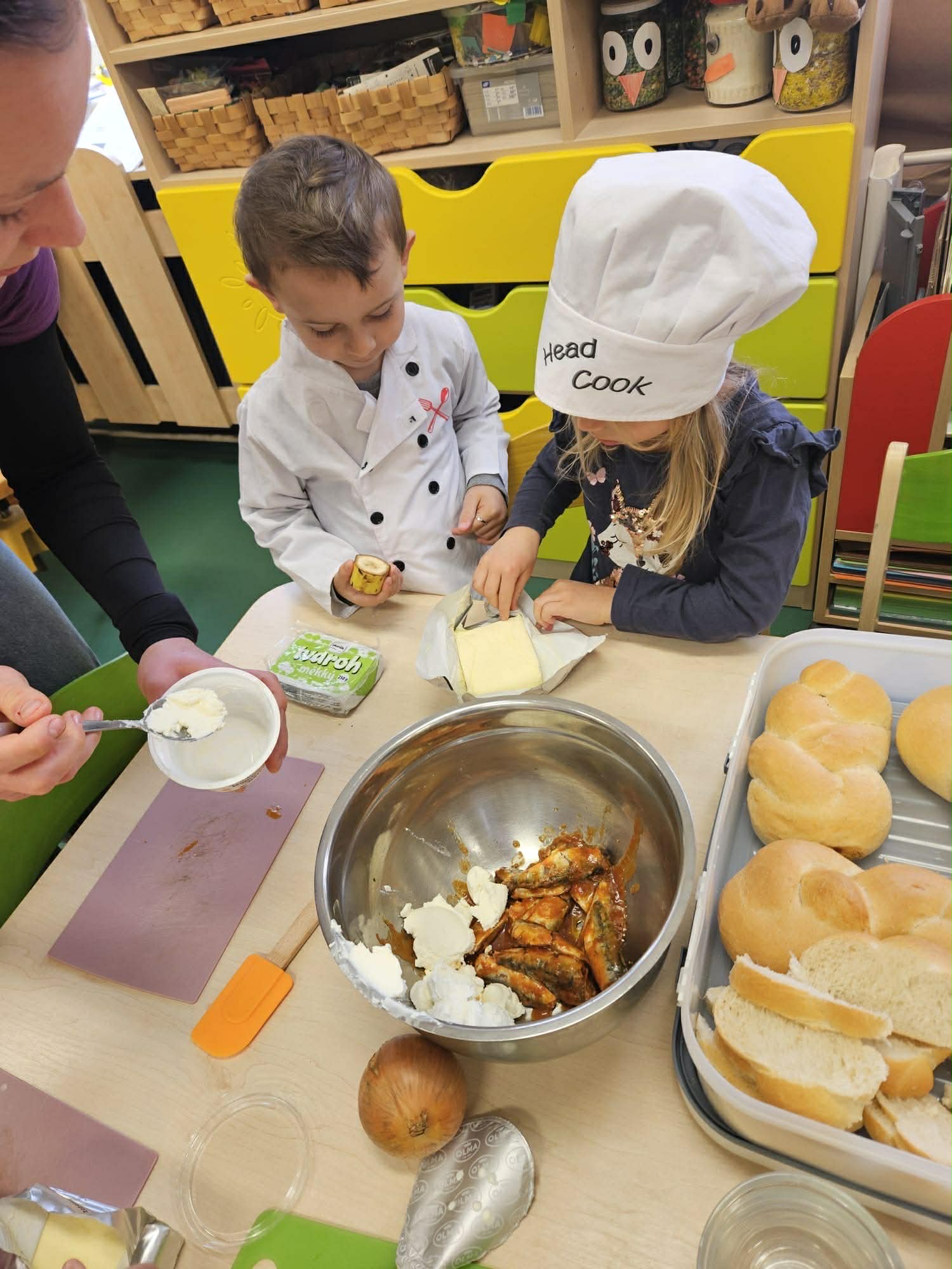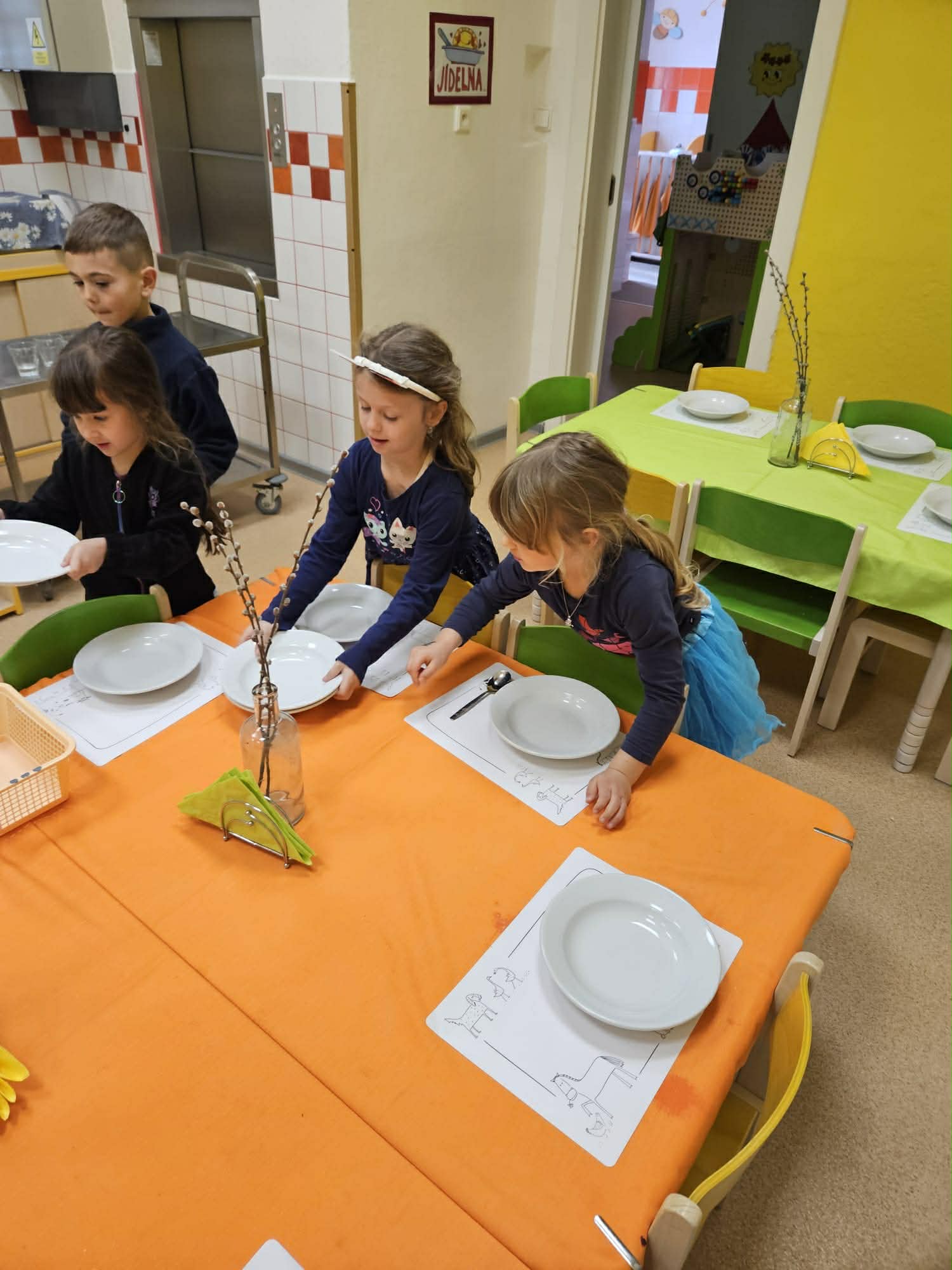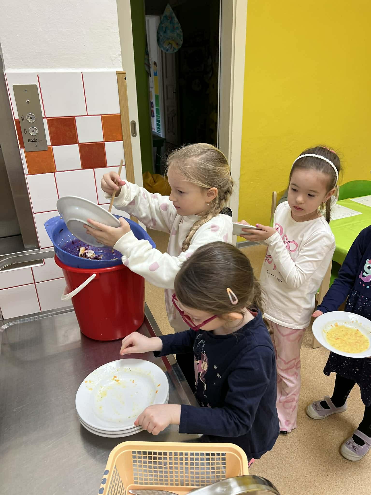 Samostatnost dětí při jídle V naší mateřské škole podporujeme děti v samostatnosti i při přípravě jídla a stolování. Při dopolední svačině si děti vyzkoušely připravit rybičkovou pomazánku. Pomáhaly s jejím mícháním, krájením pletýnek a okurky a zapojily se i do mytí nádobí v kuchyni. Při svačině si mohly zvolit nápoj podle chuti – vodu, čaj nebo jablečnou šťávu ředěnou vodou. Samostatnost rozvíjíme také u oběda. Děti si samy prostírají, polévku si nabírají v množství, které zvládnou sníst, a hlavní jídlo – hamburger s domácí houskou a trhaným kachním masem – si také samy servírují. Po jídle děti stírají zbytky do koše na bioodpad a uklízí své místo. Je vidět, že děti všech věkových kategorií se dokážou obsloužit samy a s radostí se zapojují do každodenních činností.