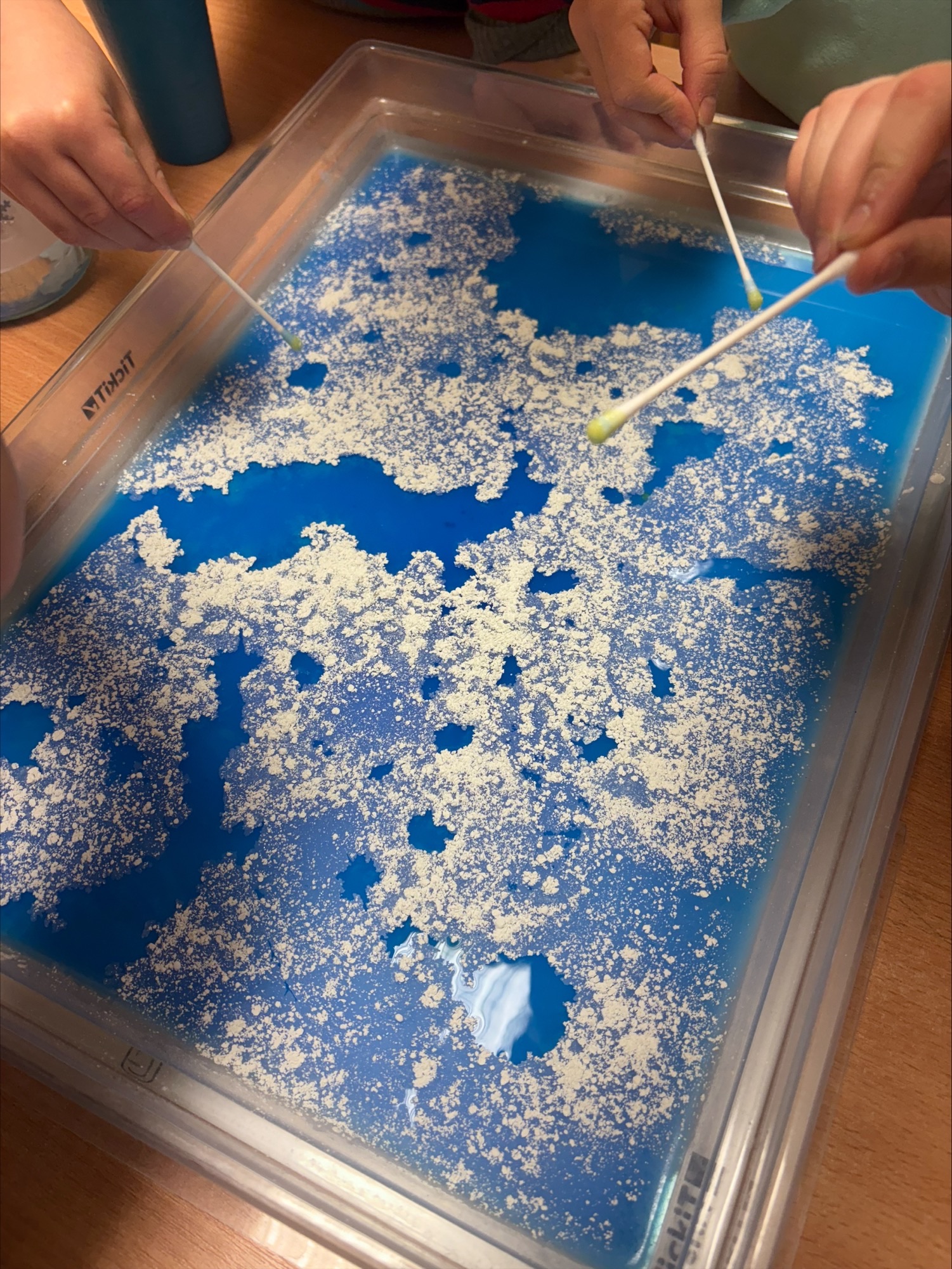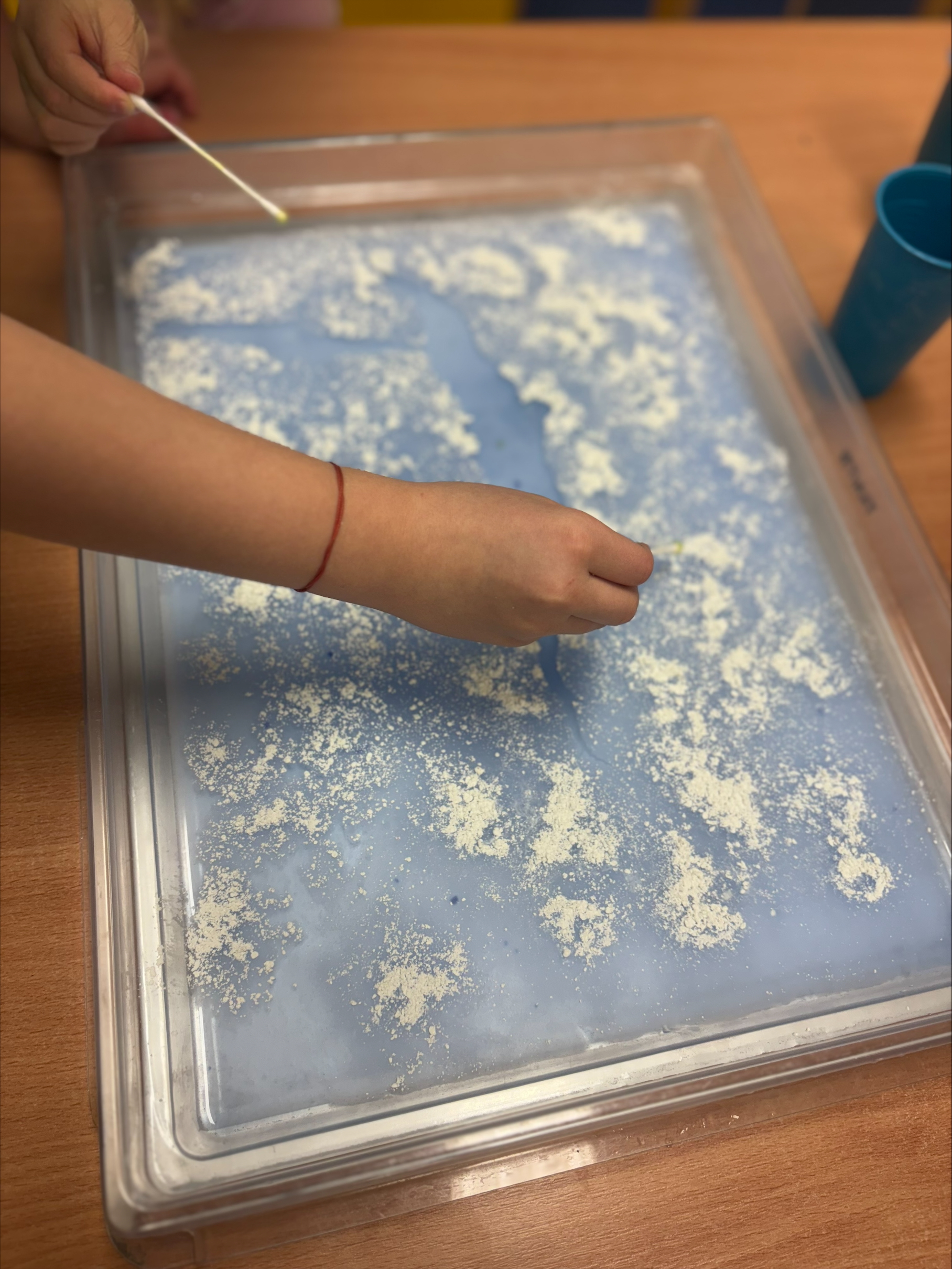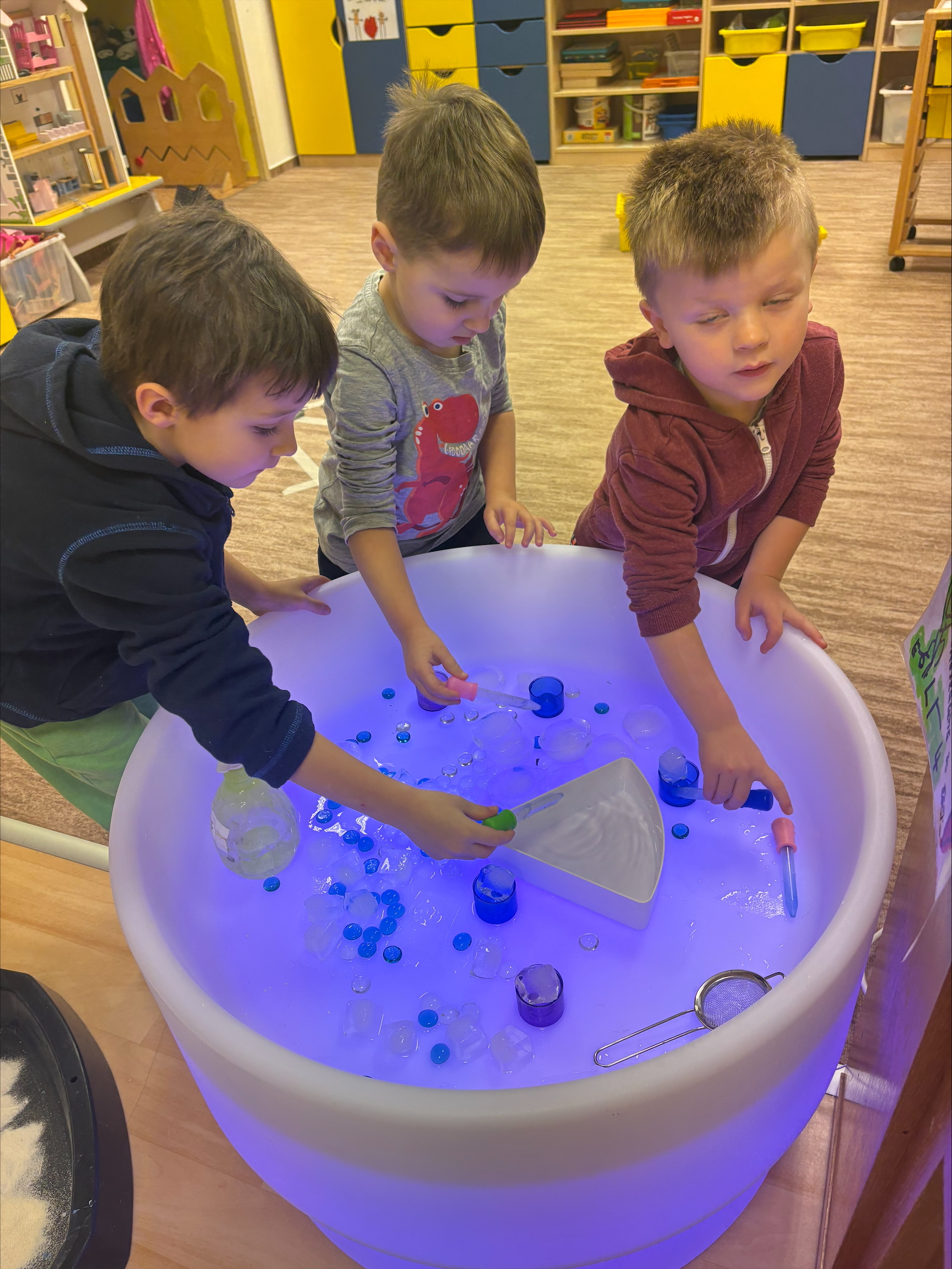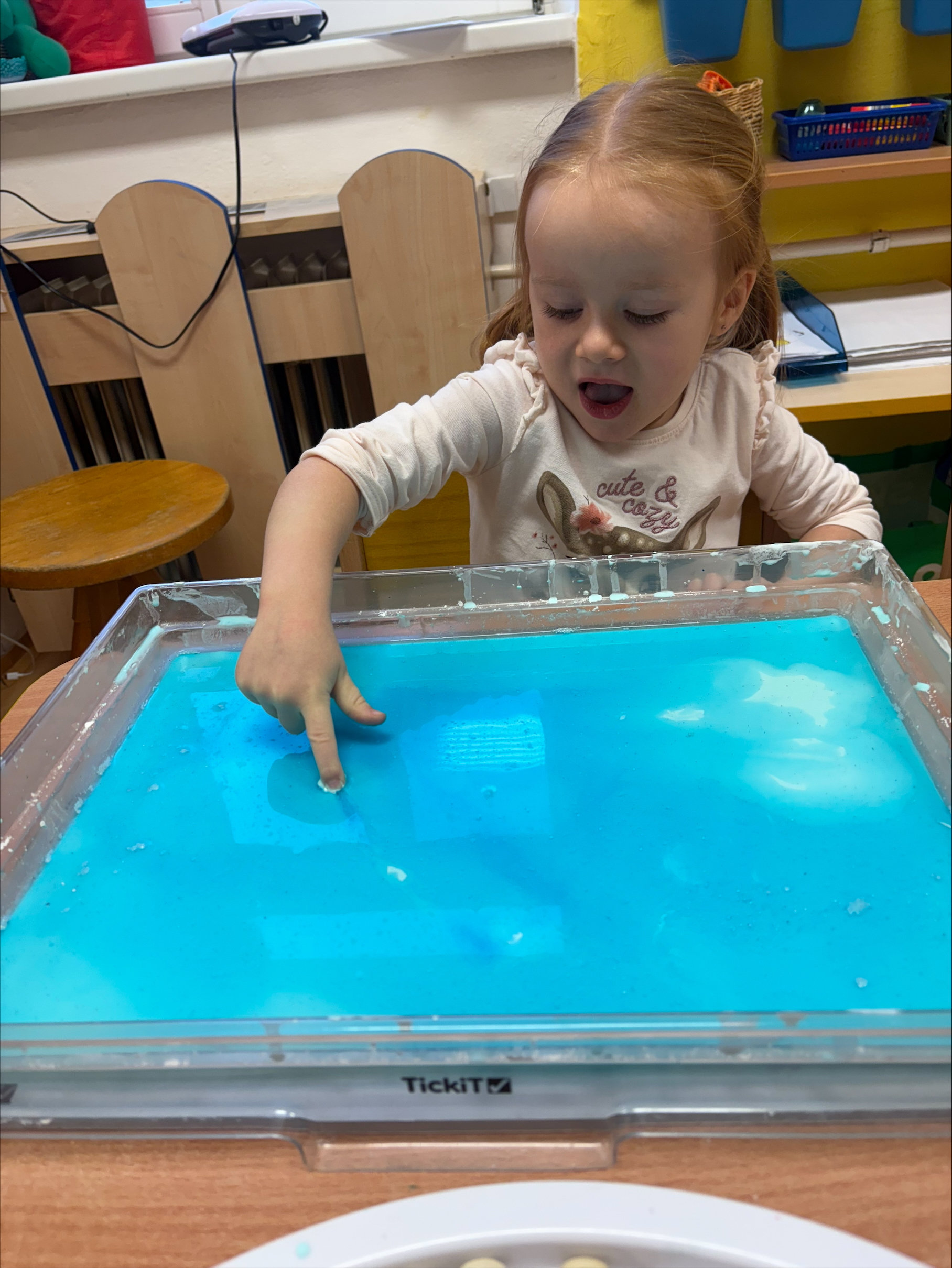 Děti objevovaly kouzlo ledu a zimních pokusů. Barvily led, pomocí pipet se snažily obarvit a zároveň rozmrazit led vodou. Společně jsme si zahráli hru s oblékáním, vyzkoušeli pokusy s pěnou a sodou a nechyběla ani výroba umělého sněhu a ledových ker. Celé ledové království děti nadchlo a s radostí zkoumaly, co všechno led dokáže. ❄️🐸