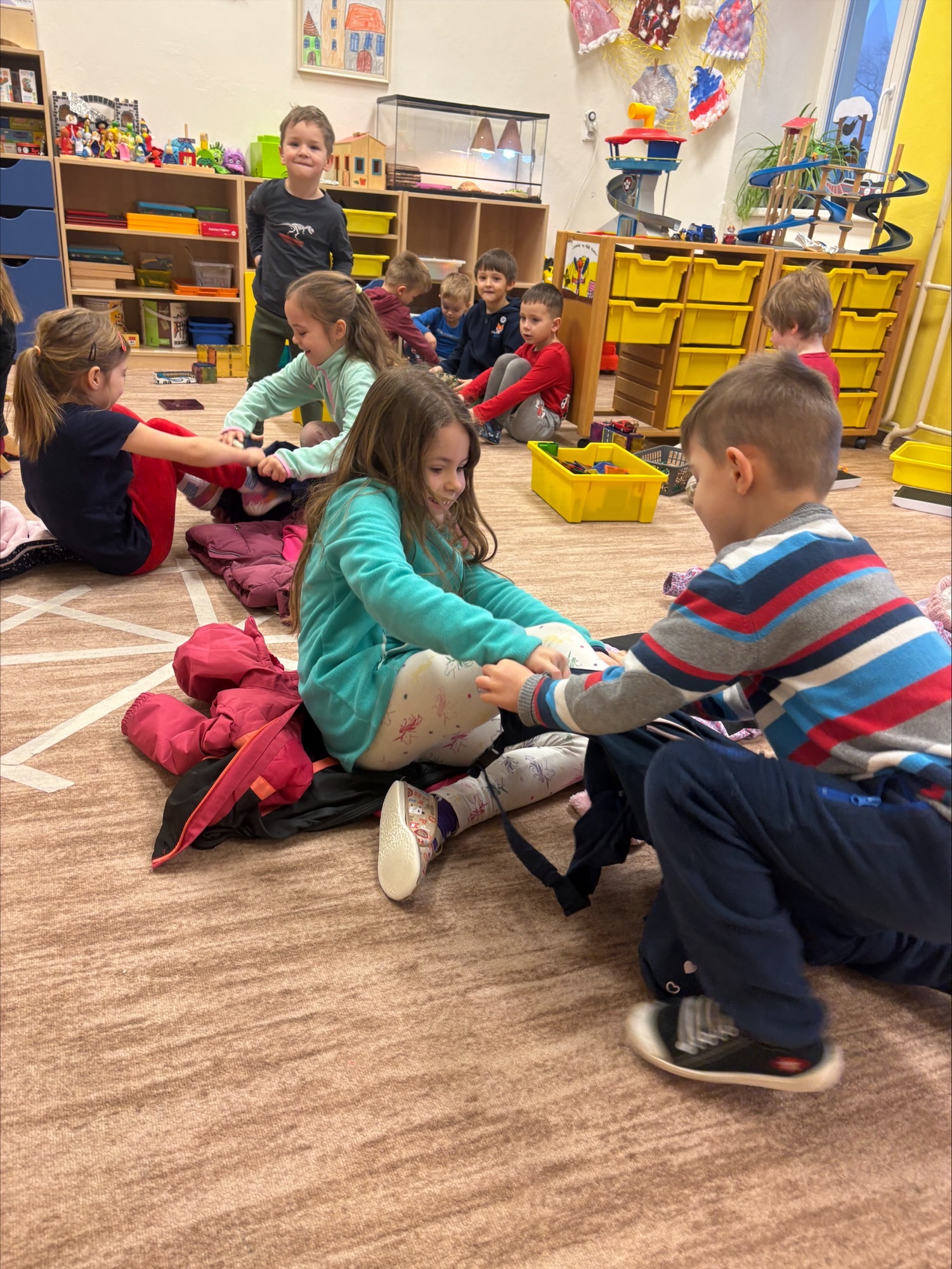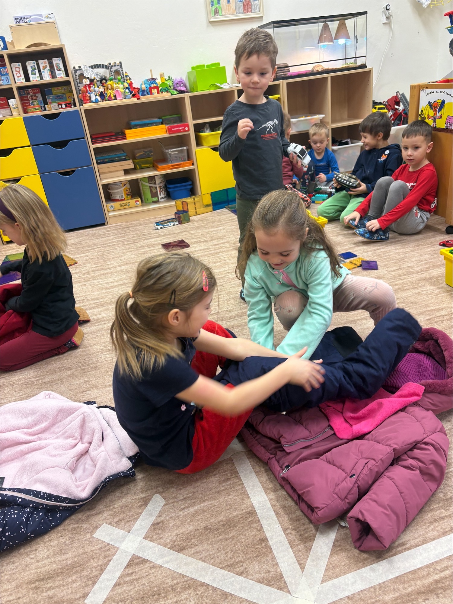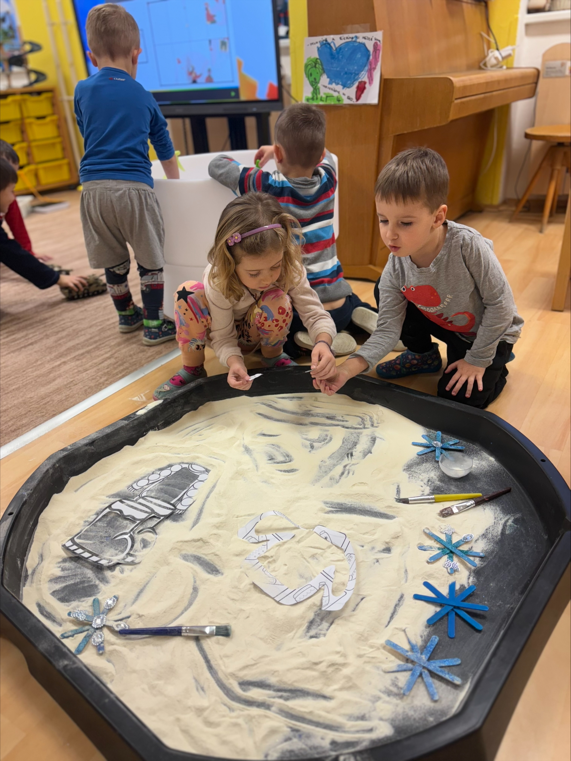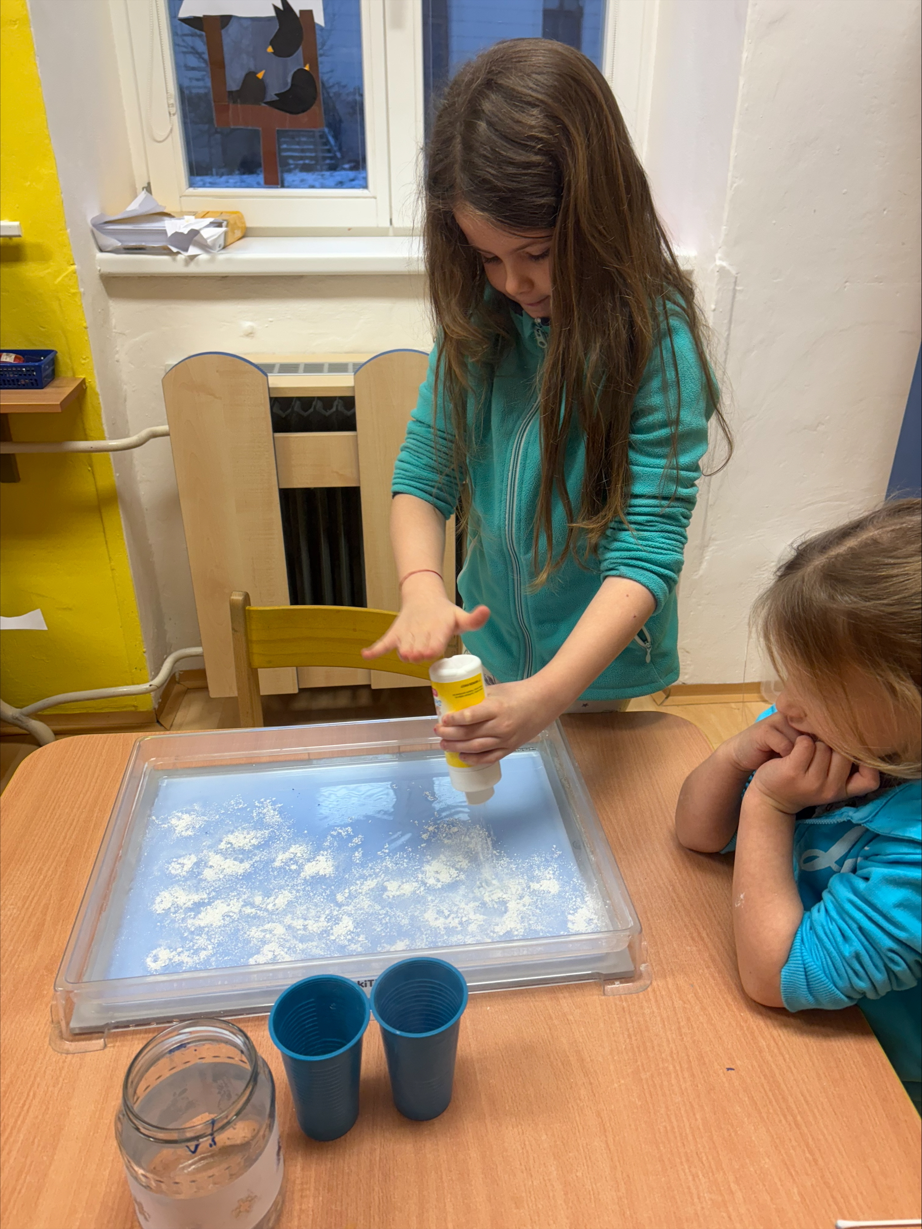 Děti objevovaly kouzlo ledu a zimních pokusů. Barvily led, pomocí pipet se snažily obarvit a zároveň rozmrazit led vodou. Společně jsme si zahráli hru s oblékáním, vyzkoušeli pokusy s pěnou a sodou a nechyběla ani výroba umělého sněhu a ledových ker. Celé ledové království děti nadchlo a s radostí zkoumaly, co všechno led dokáže. ❄️🐸