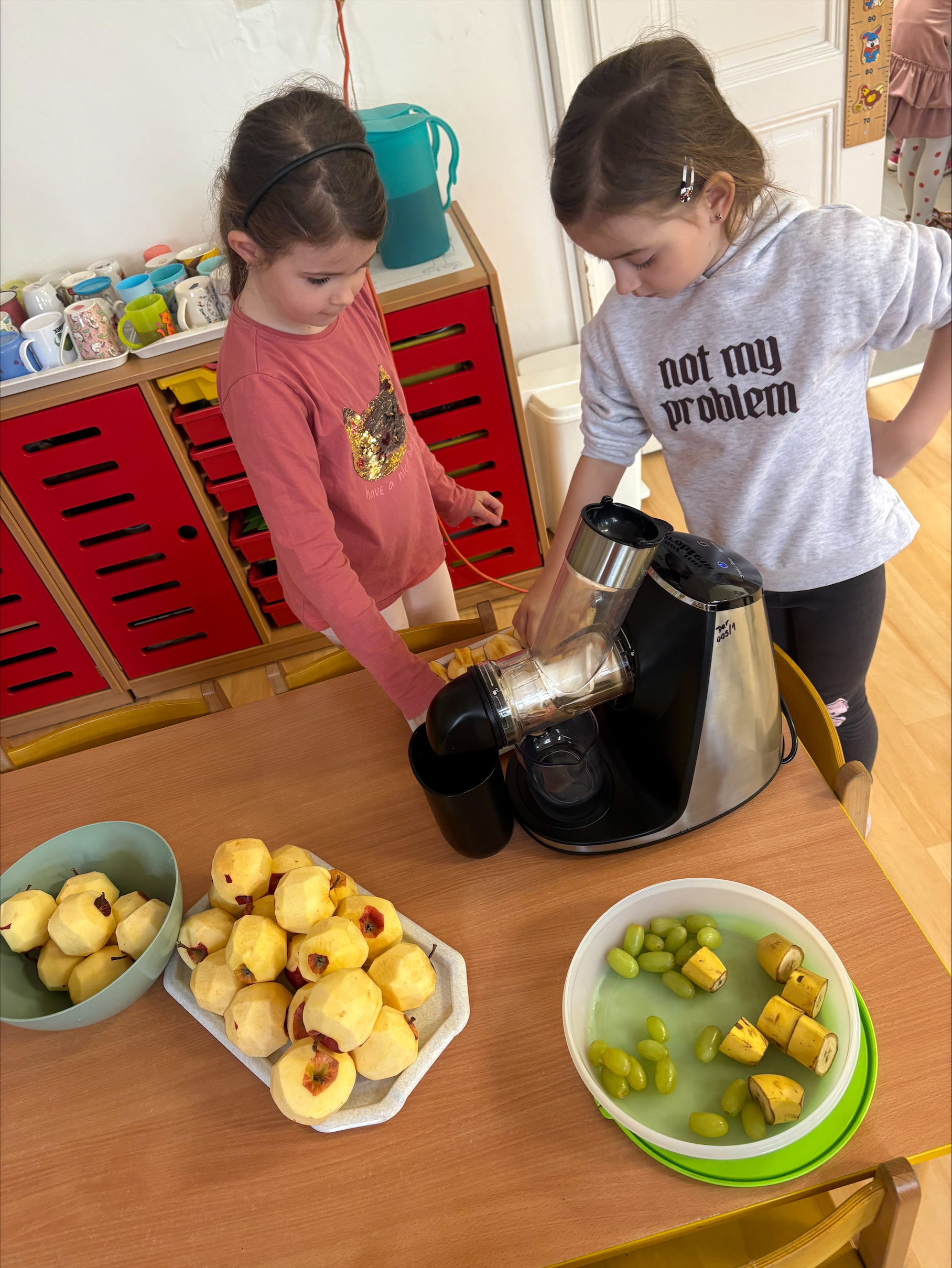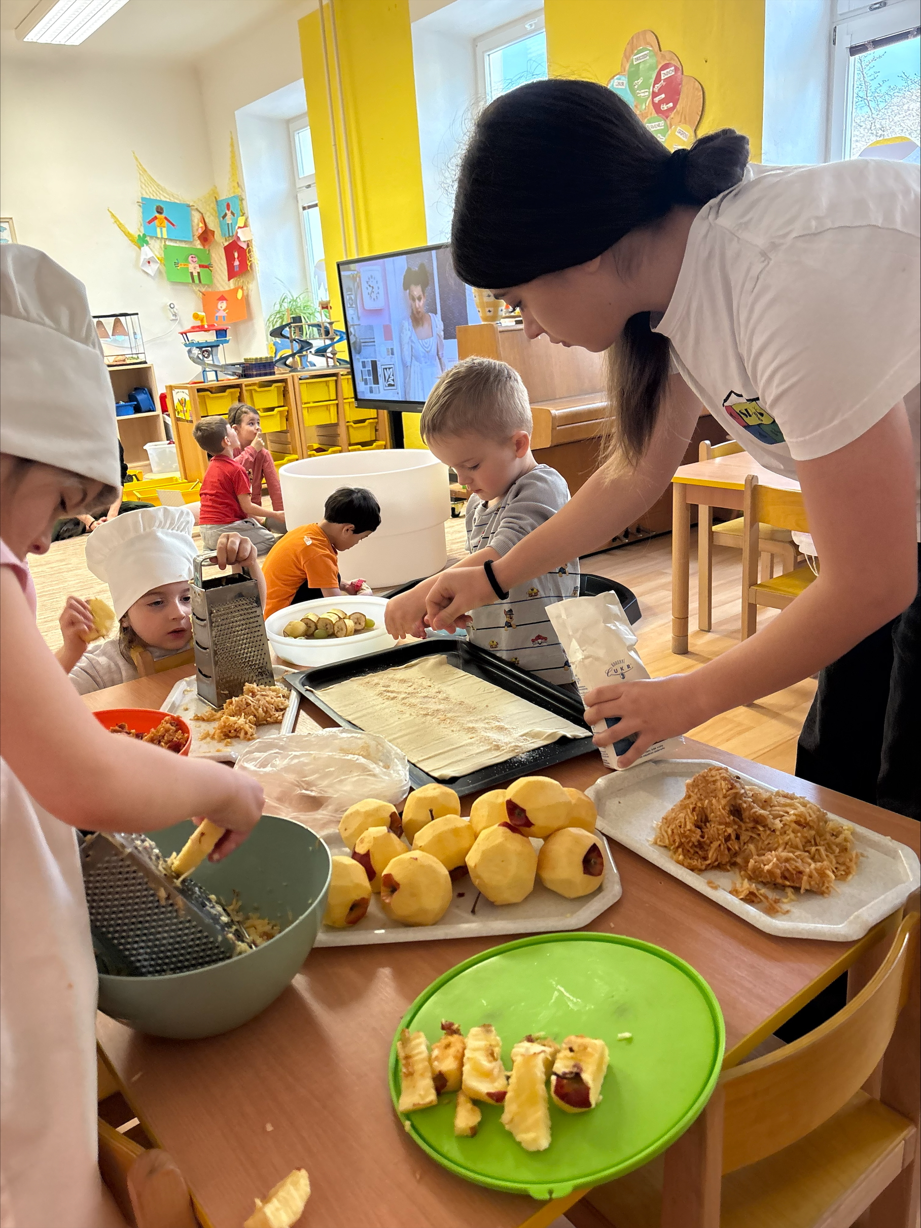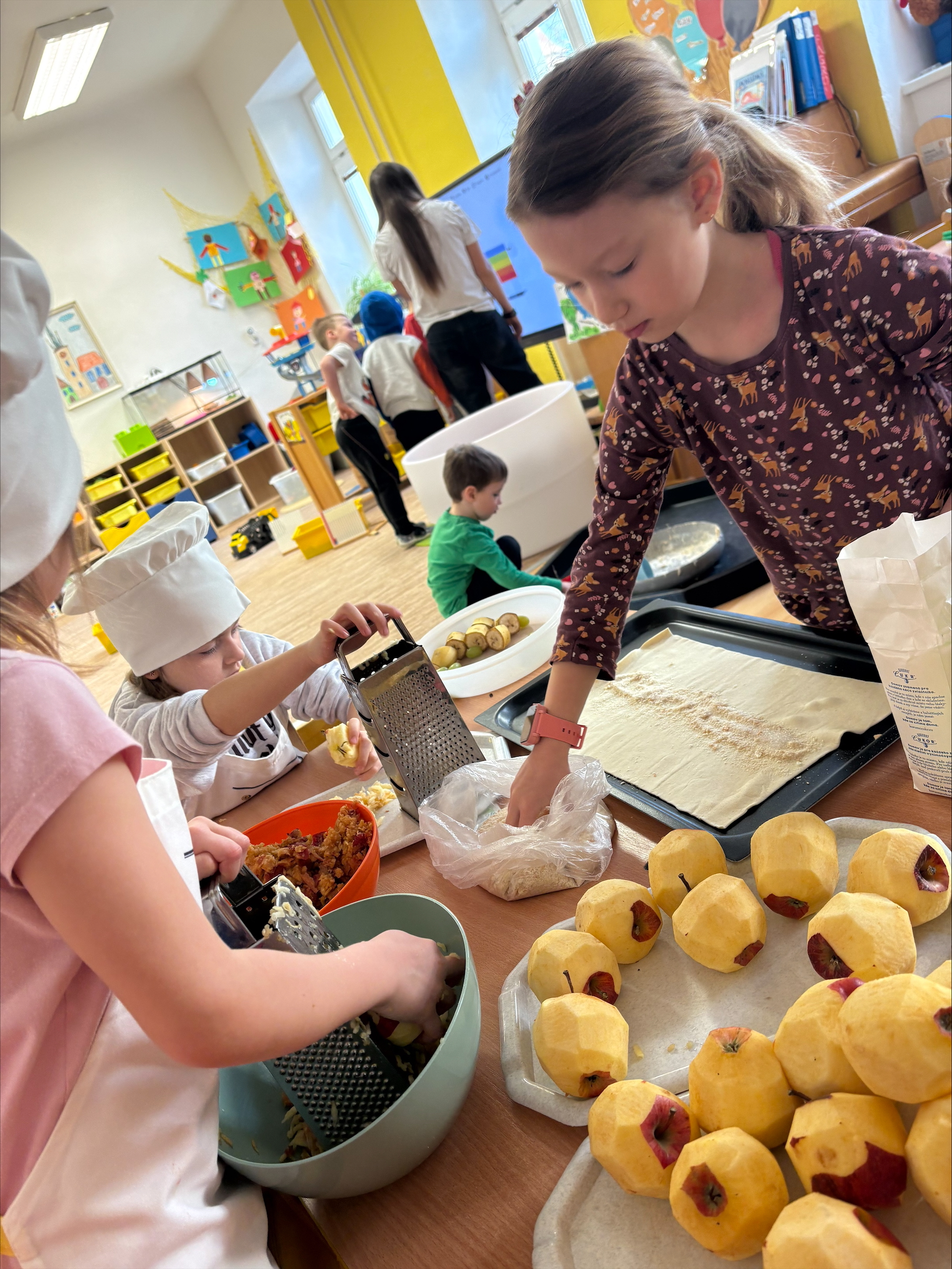 Dnes jsme u žabiček oslavili Mezinárodní den jídelny-pomohli jsme paním kuchařkám a upekli štrůdly na odpolední svačinku pro nás i kamarády,odšťavňili jablka a vykouzlilo úsměv na tváři dárkem našim paním kuchařkám.