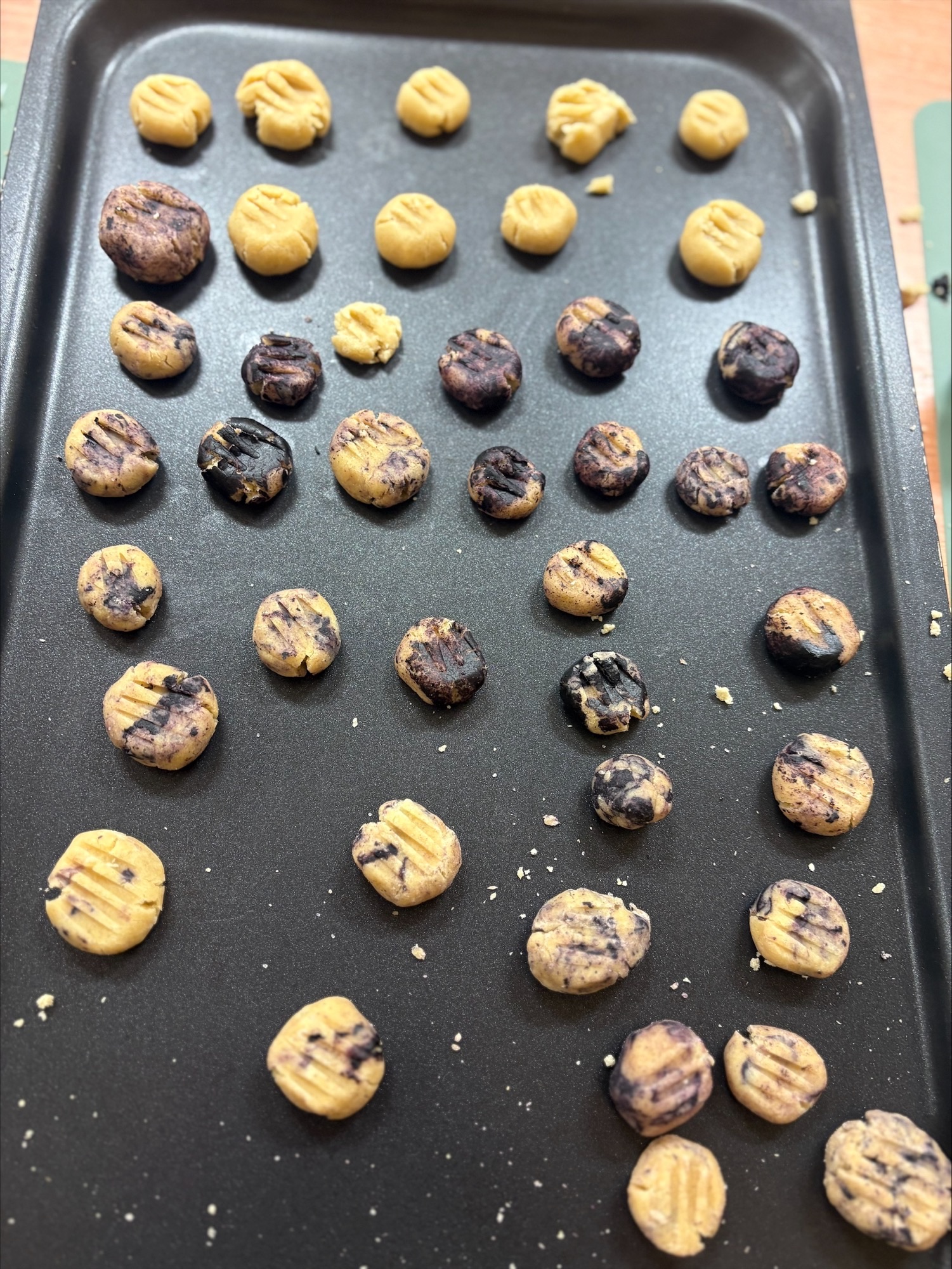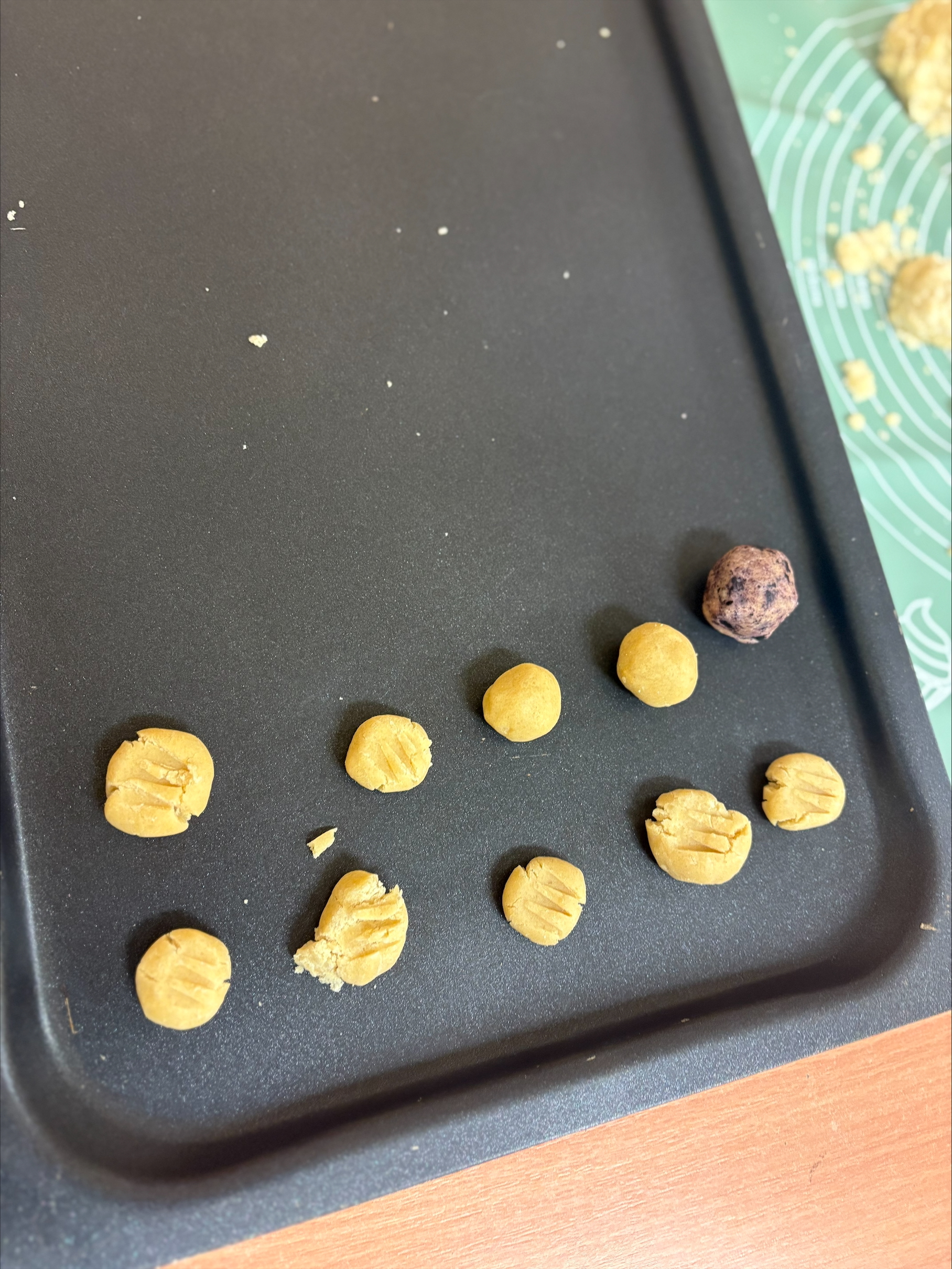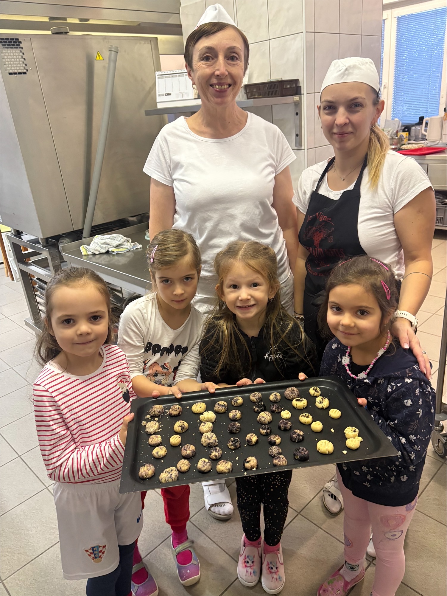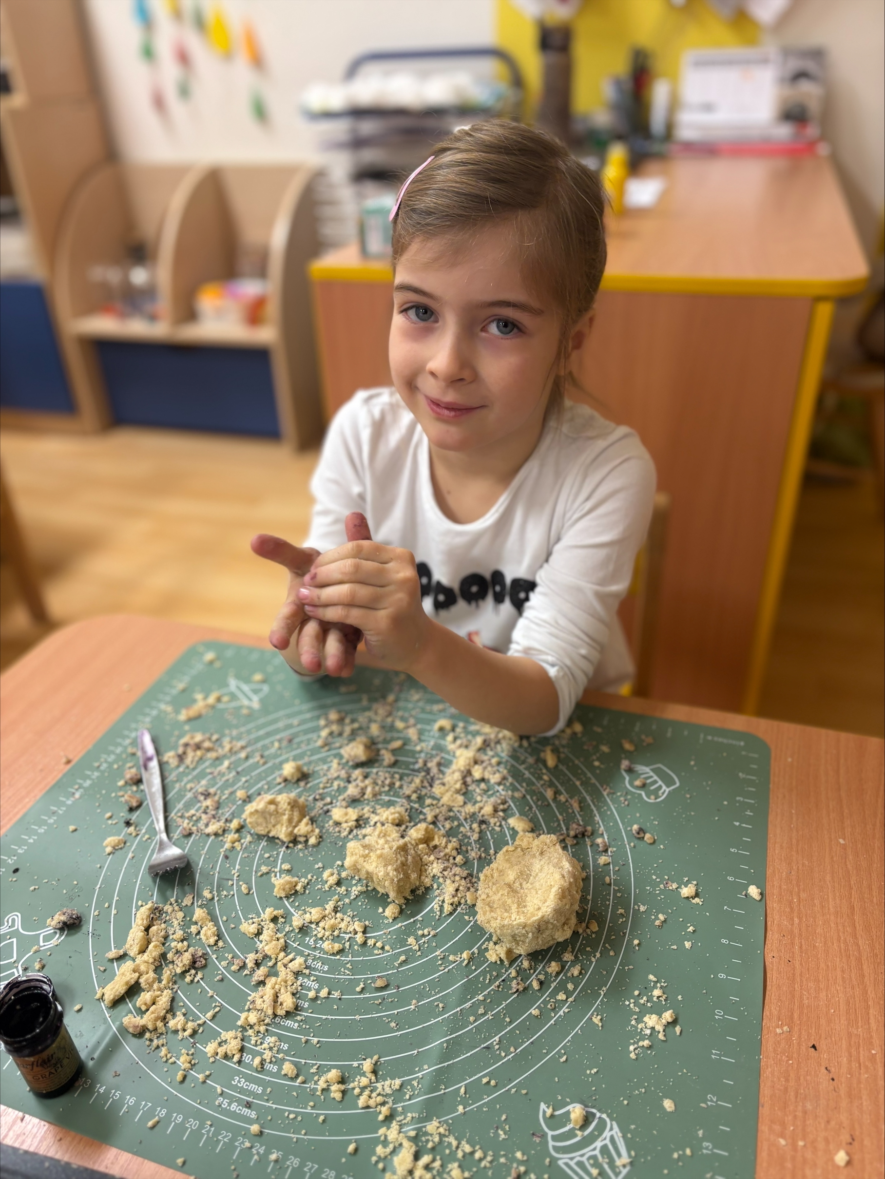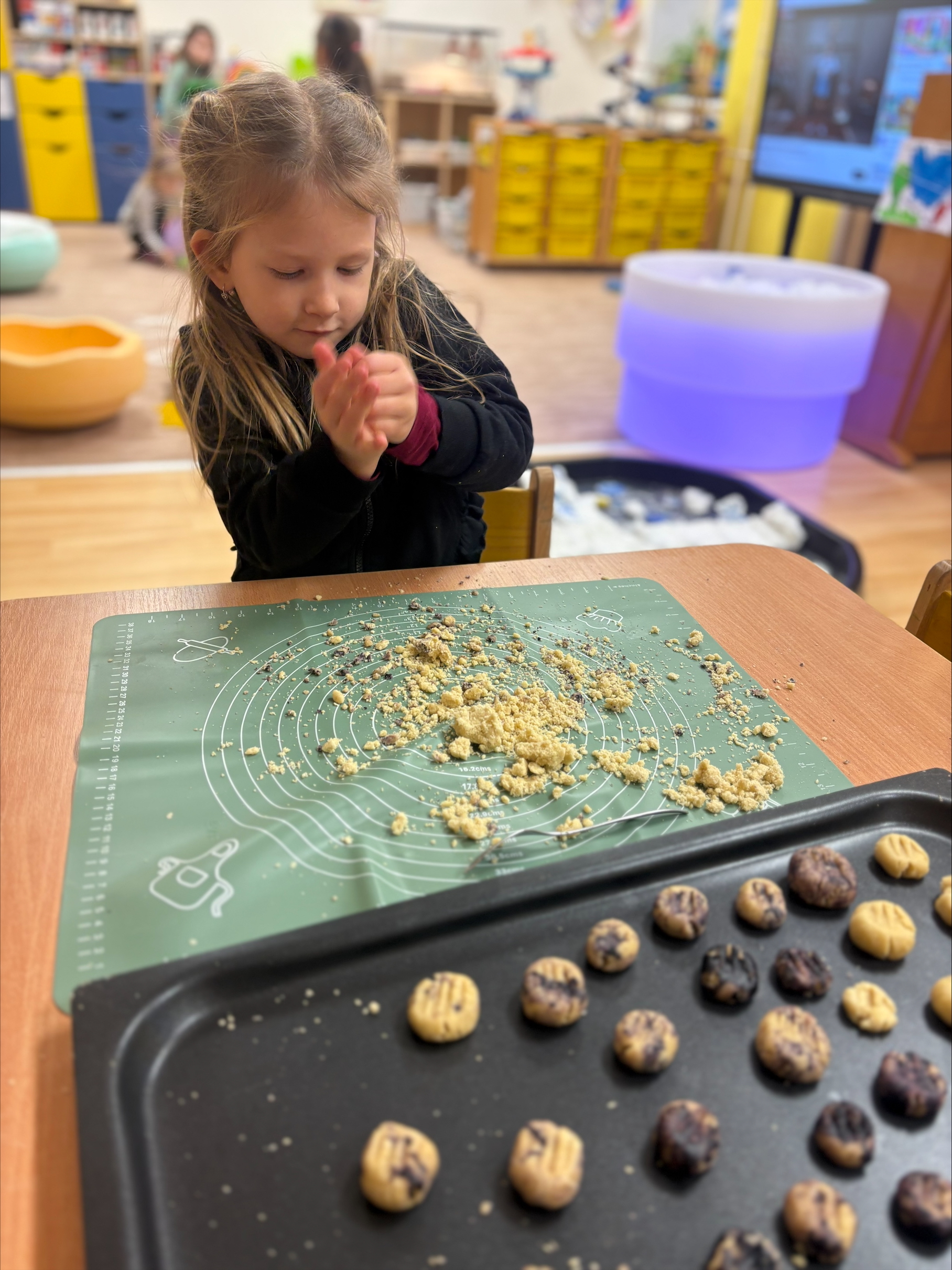 Děti si s radostí hrály s těstem, tvořily malé kuličky a vytvářely z nich sněhuláky. Kuličky společně posypaly a přidaly potravinářské barvivo. Celé tvoření je moc bavilo a na závěr si na vlastnoručně připravených „ledových“ sušenkách společně pochutnaly. 🍪❄️