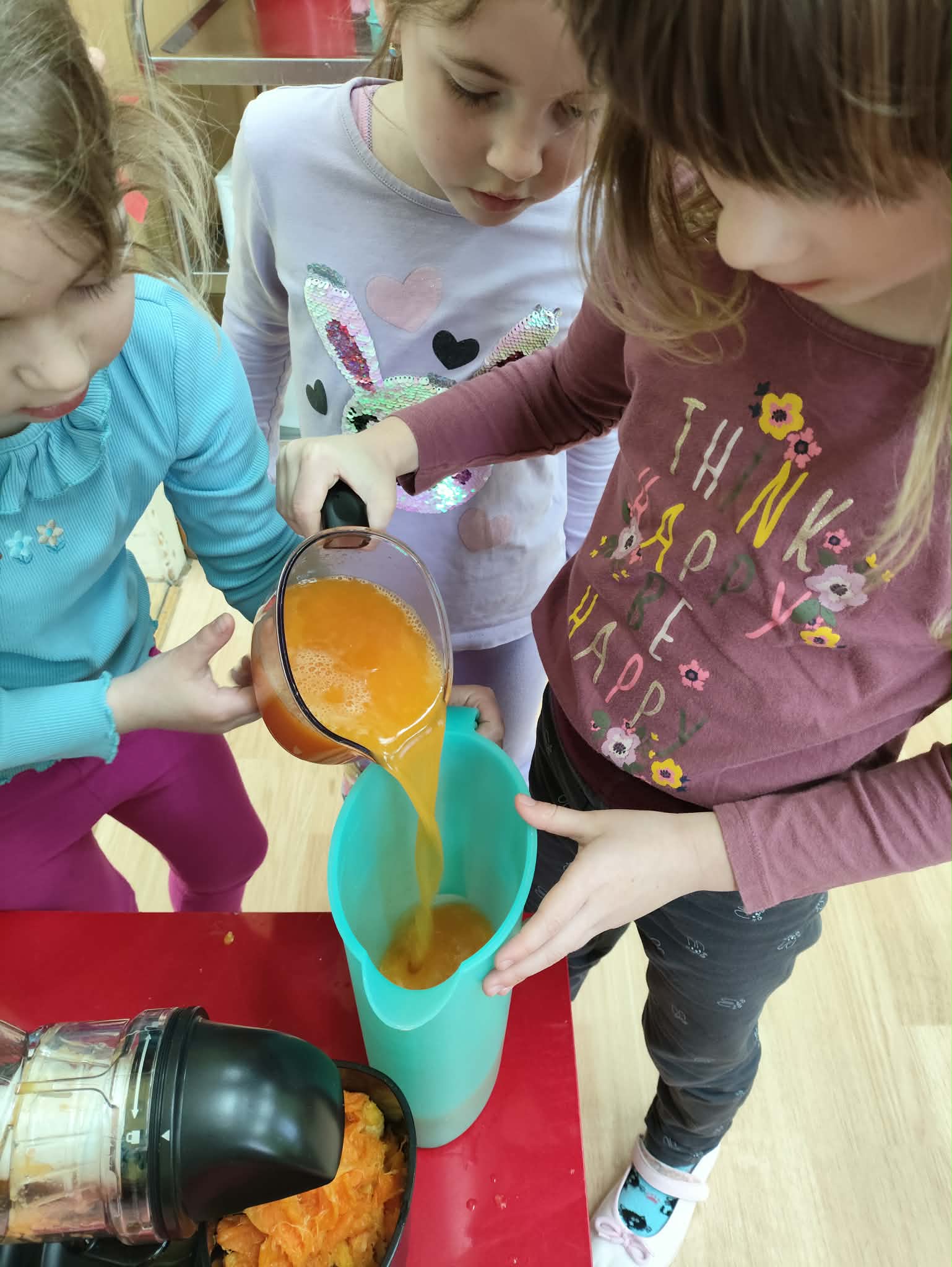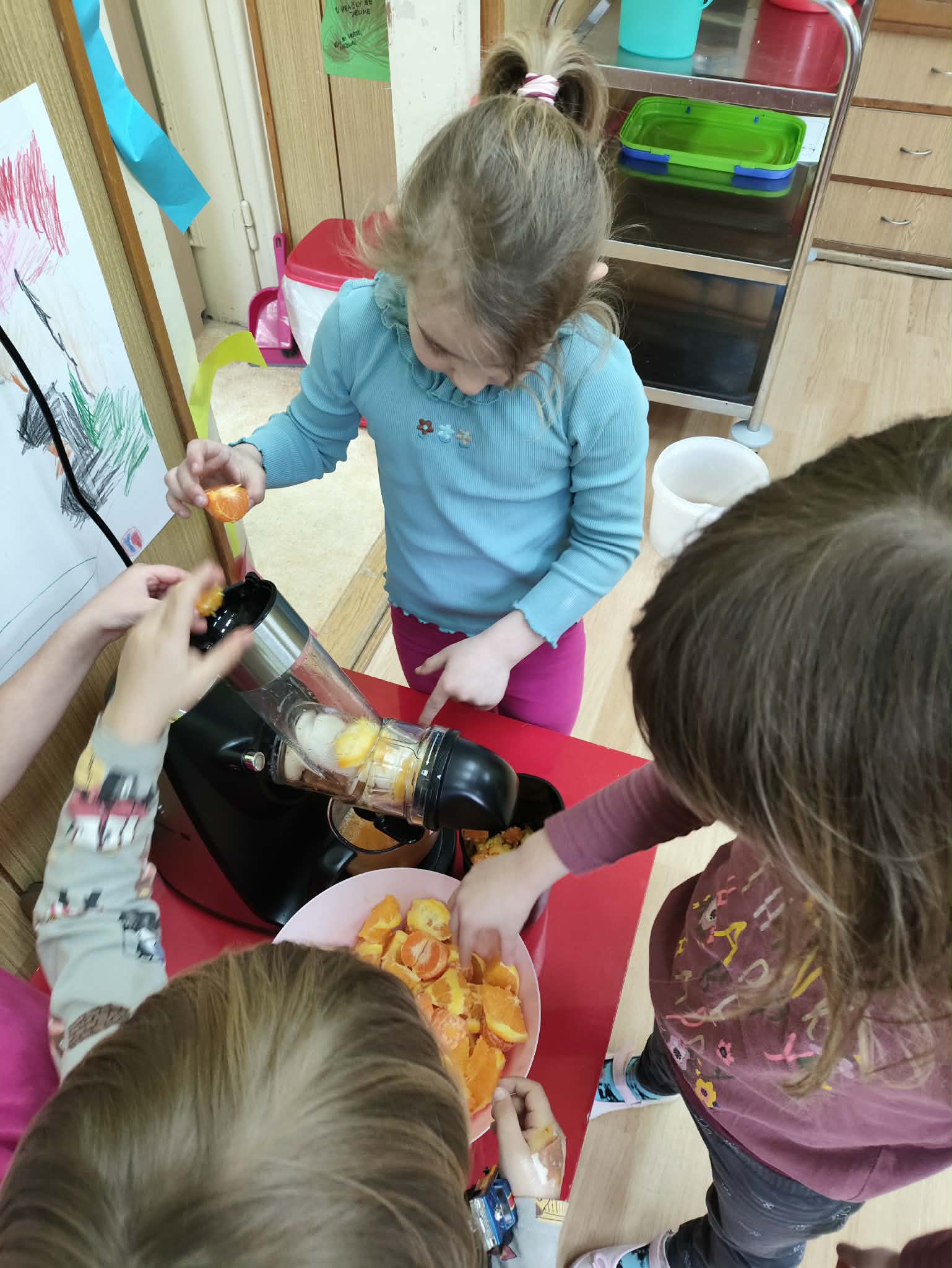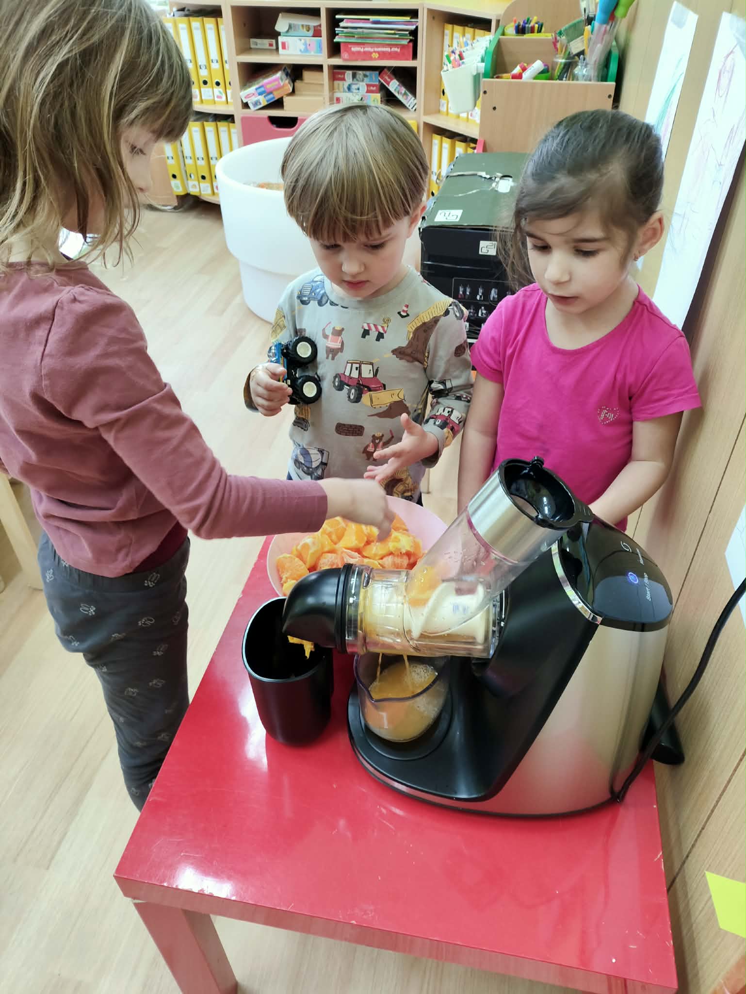 Děti si vyzkoušely práci s elektrickým odšťavňovačem a samy si připravily čerstvou pomerančovou šťávu. Nejprve jsme si společně povídali o tom, odkud pomeranče pocházejí a proč jsou pro naše tělo zdravé. Děti se dozvěděly, že obsahují vitamín C, který podporuje imunitu a pomáhá chránit naše zdraví.