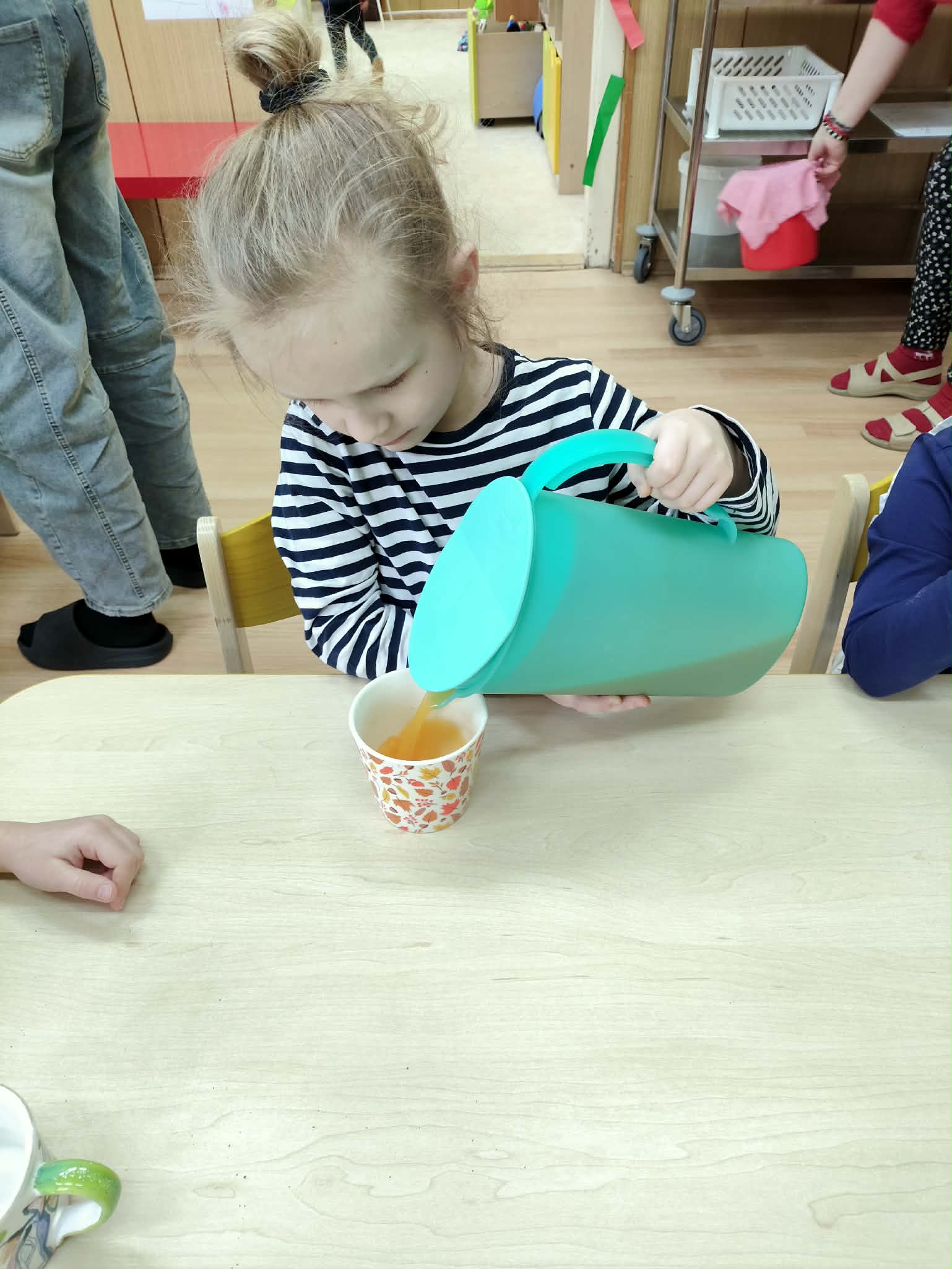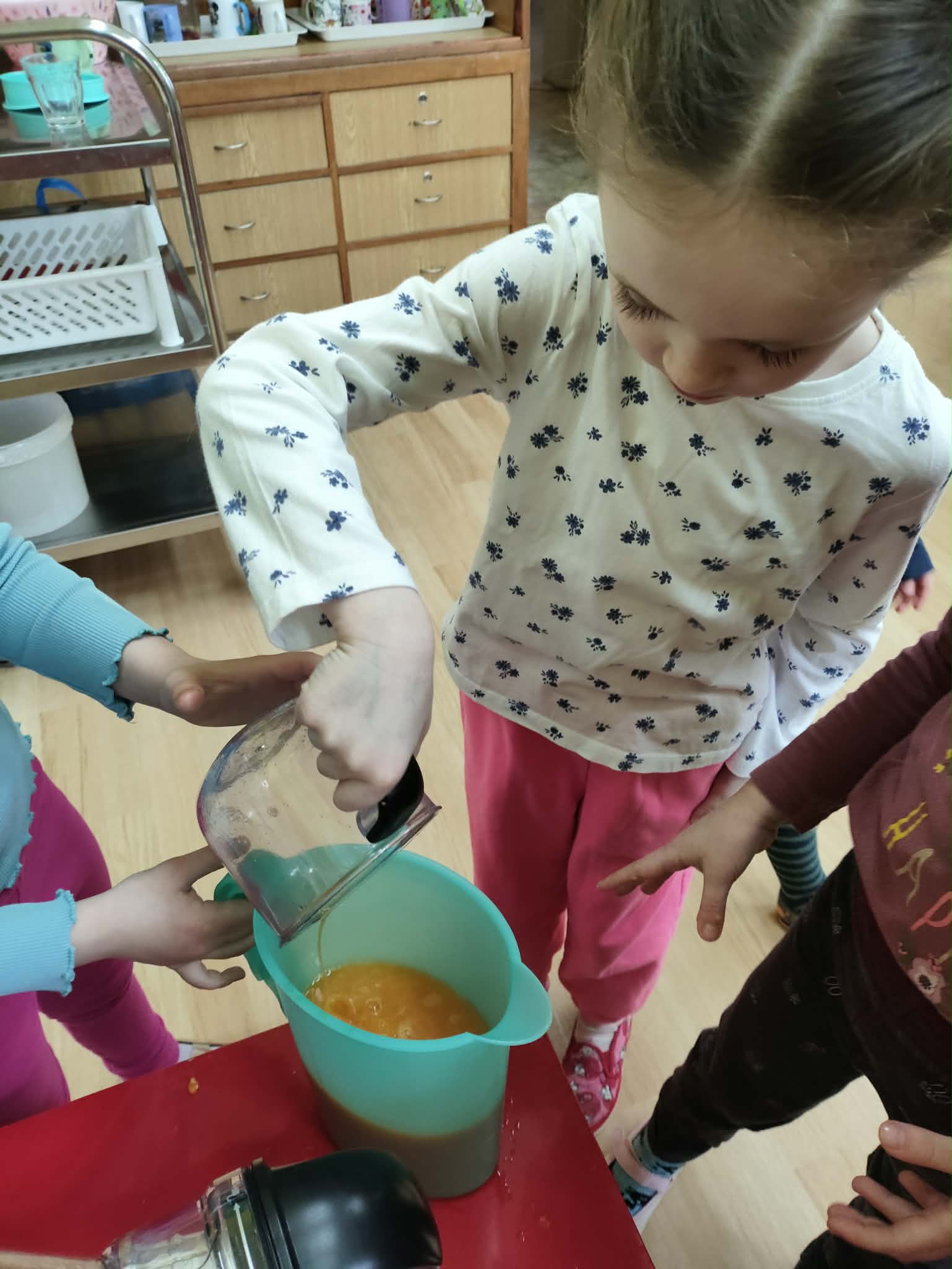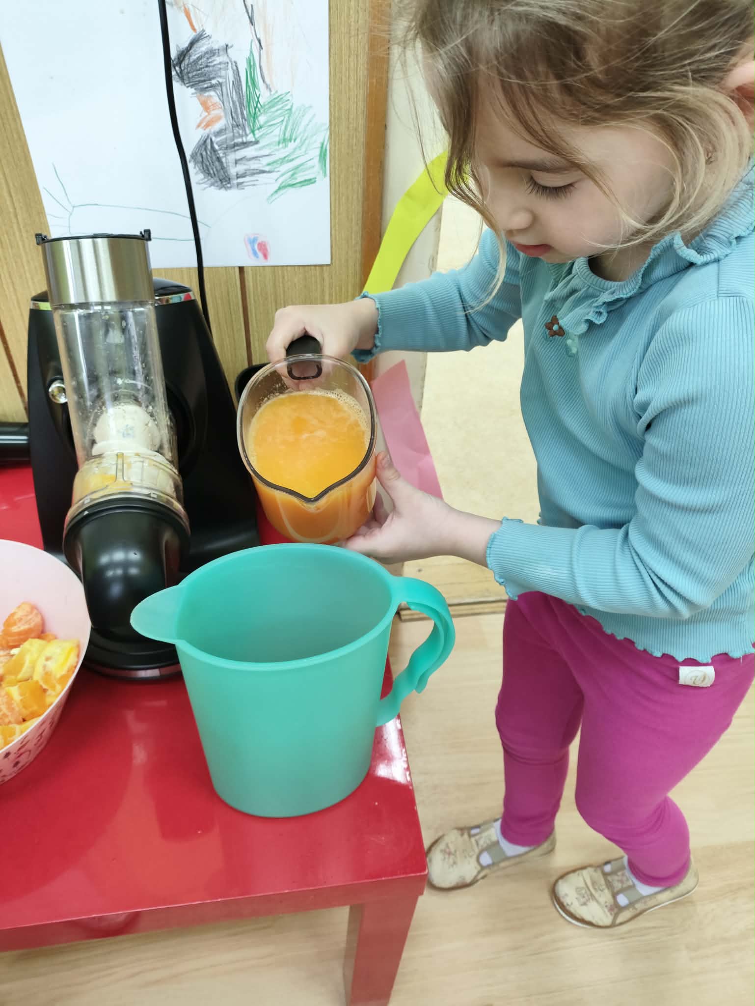 Děti si vyzkoušely práci s elektrickým odšťavňovačem a samy si připravily čerstvou pomerančovou šťávu. Nejprve jsme si společně povídali o tom, odkud pomeranče pocházejí a proč jsou pro naše tělo zdravé. Děti se dozvěděly, že obsahují vitamín C, který podporuje imunitu a pomáhá chránit naše zdraví.