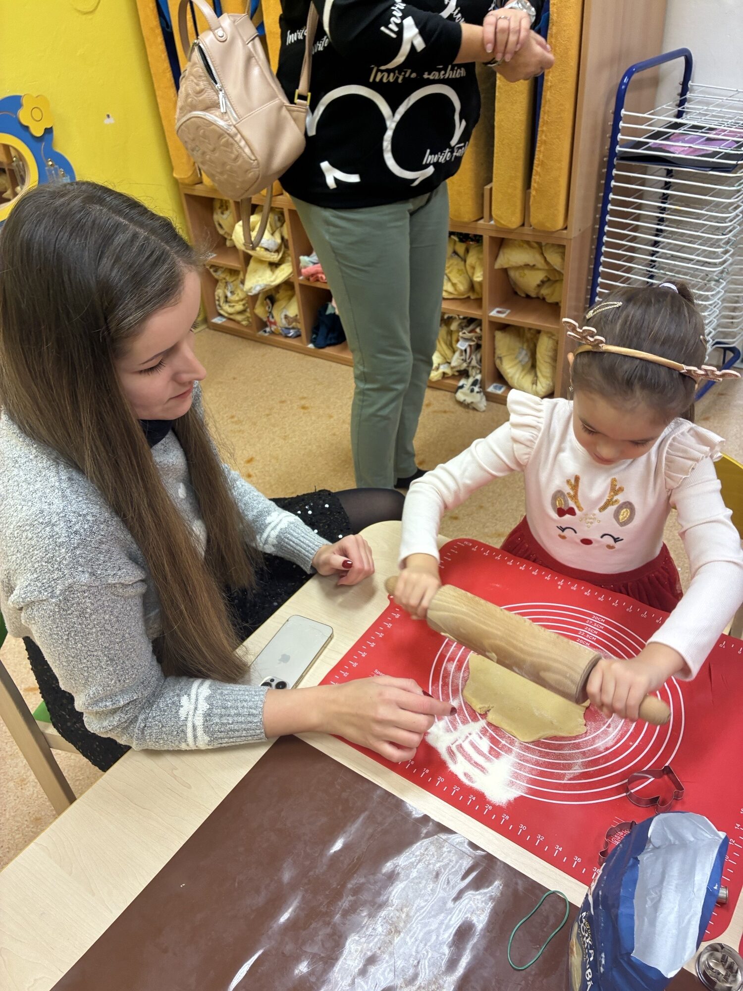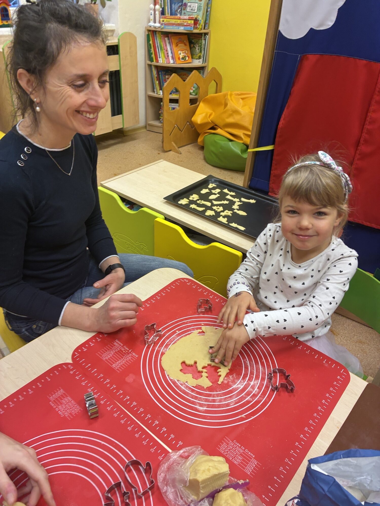 Maminky si mezitím s dětmi užívaly pečení – společně vykrajovaly linecké cukroví, zdobily perníčkové postavičky a děti si také vyzkoušely vyškrabávání vánočních ozdob.