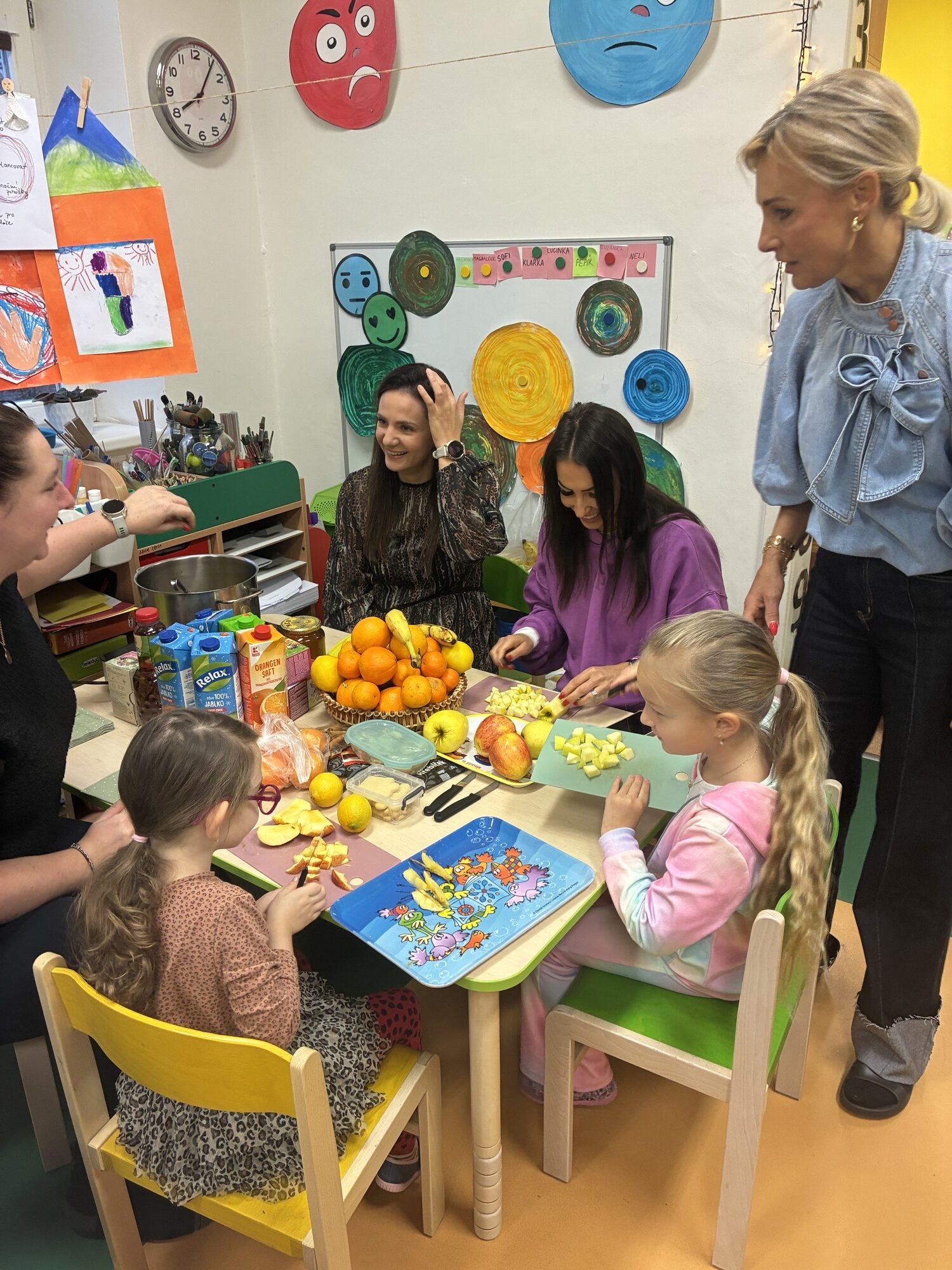 Tatínkové s dětmi vařili vánoční nealkoholický punč, který provoněl celou třídu. Děti se s chutí zapojily do krájení ovoce a s radostí sledovaly, jak se z jednotlivých surovin rodí horký zimní nápoj.