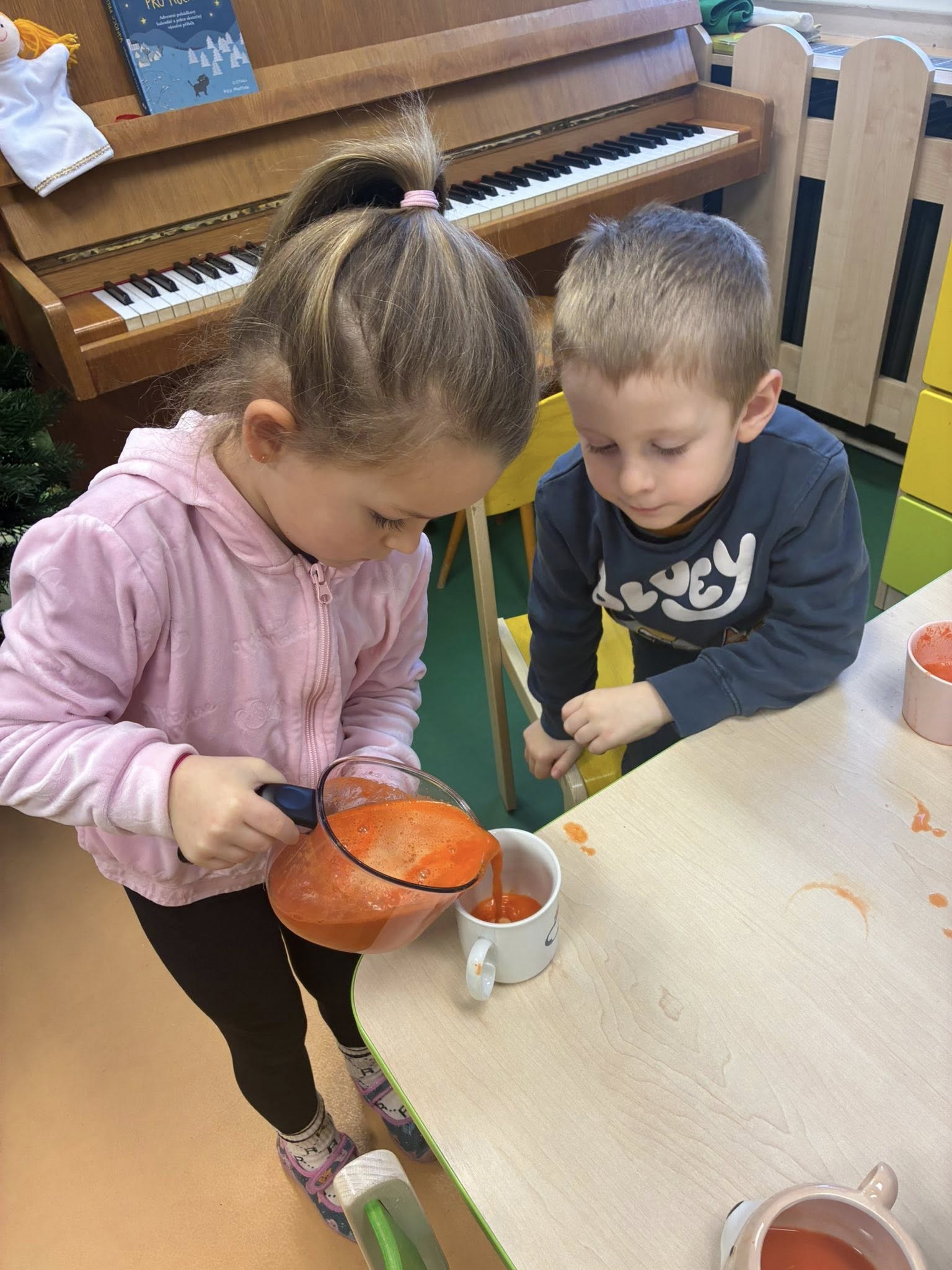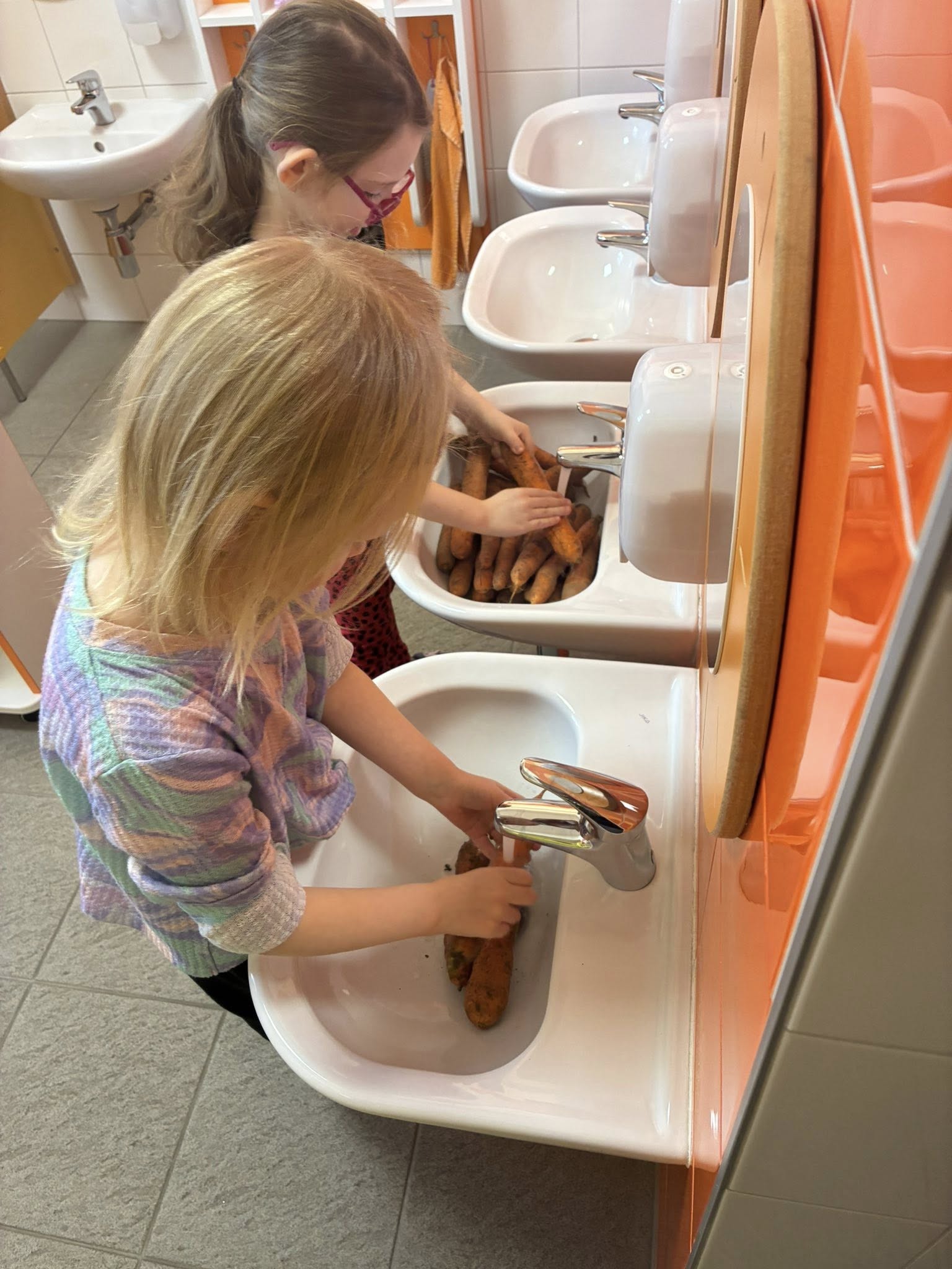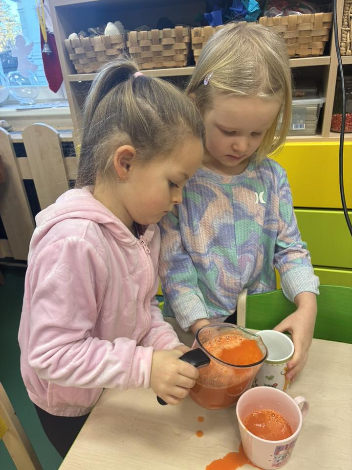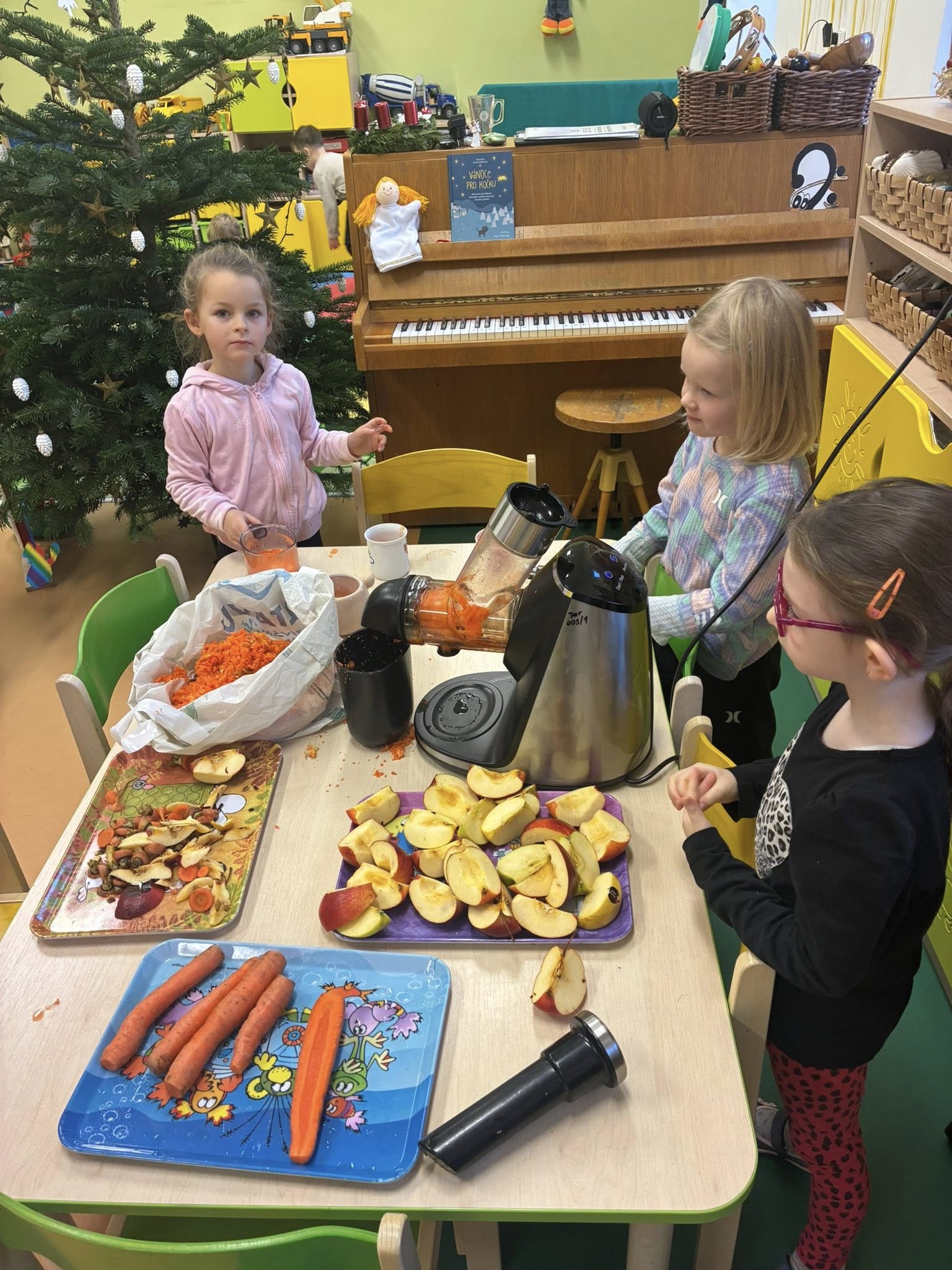 V rámci spolupráce s rodiči nám dnes Olík přinesl velký pytel krásné čerstvé mrkve. Děti se s chutí pustily do práce – nejprve mrkve pečlivě umyly a poté si je samostatně odšťavňovaly. Společně jsme si tak připravili lahodný a zdravý nápoj plný vitamínů, který nám pomůže v boji proti bacilům.