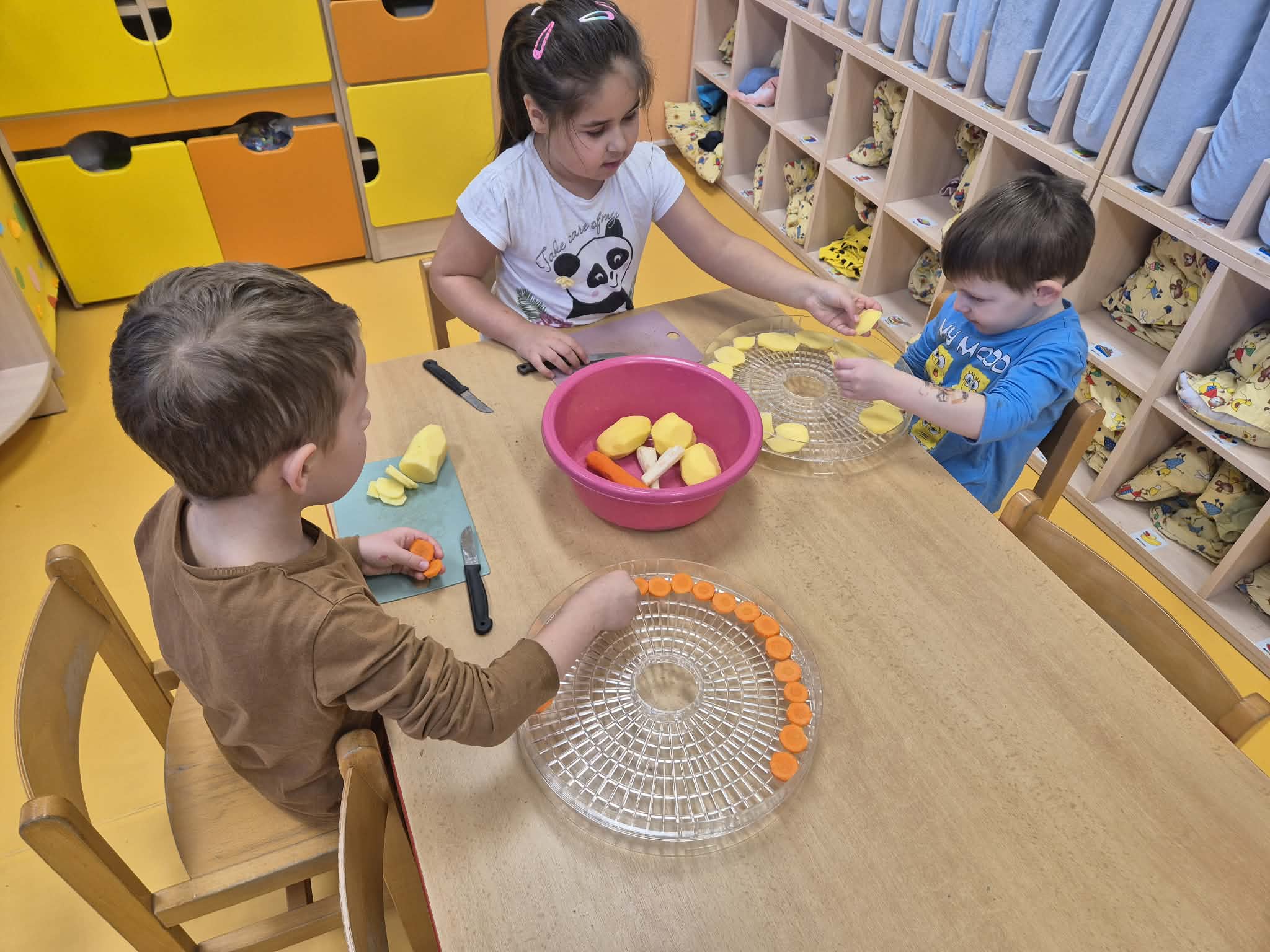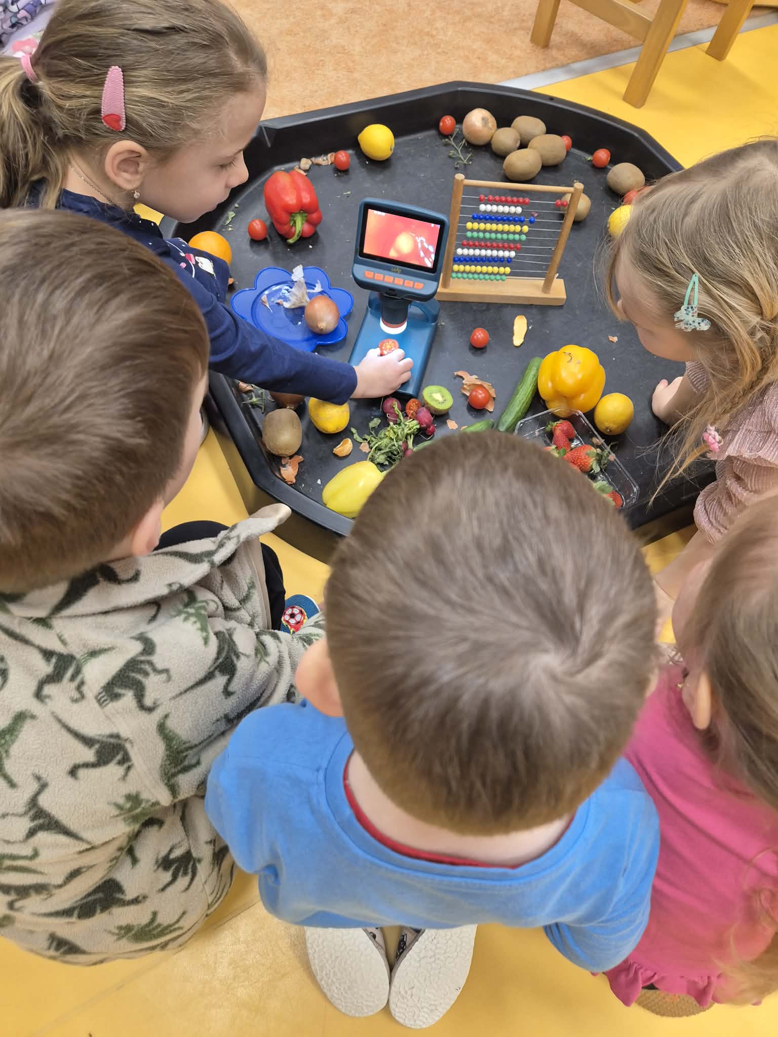 U Motýlků jsme si užili veselý a voňavý Vitamínový týden plný barev, chutí a zdravých dobrot. Děti krájely ovoce, připravovaly ovocné špízy a vyzkoušely si také odšťavňování, při kterém vznikly lahodné šťávy a nechybělo ani malování ovocem a pozorování pod mikroskopem.