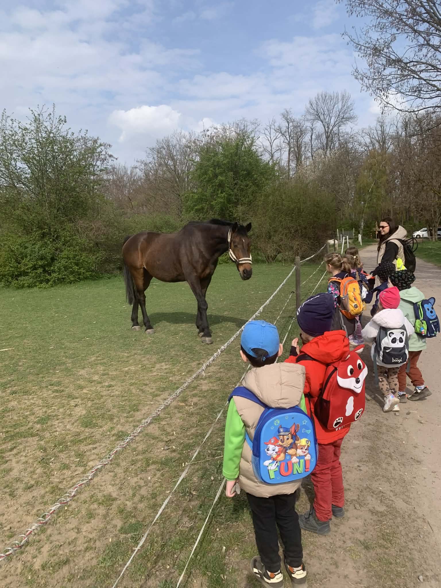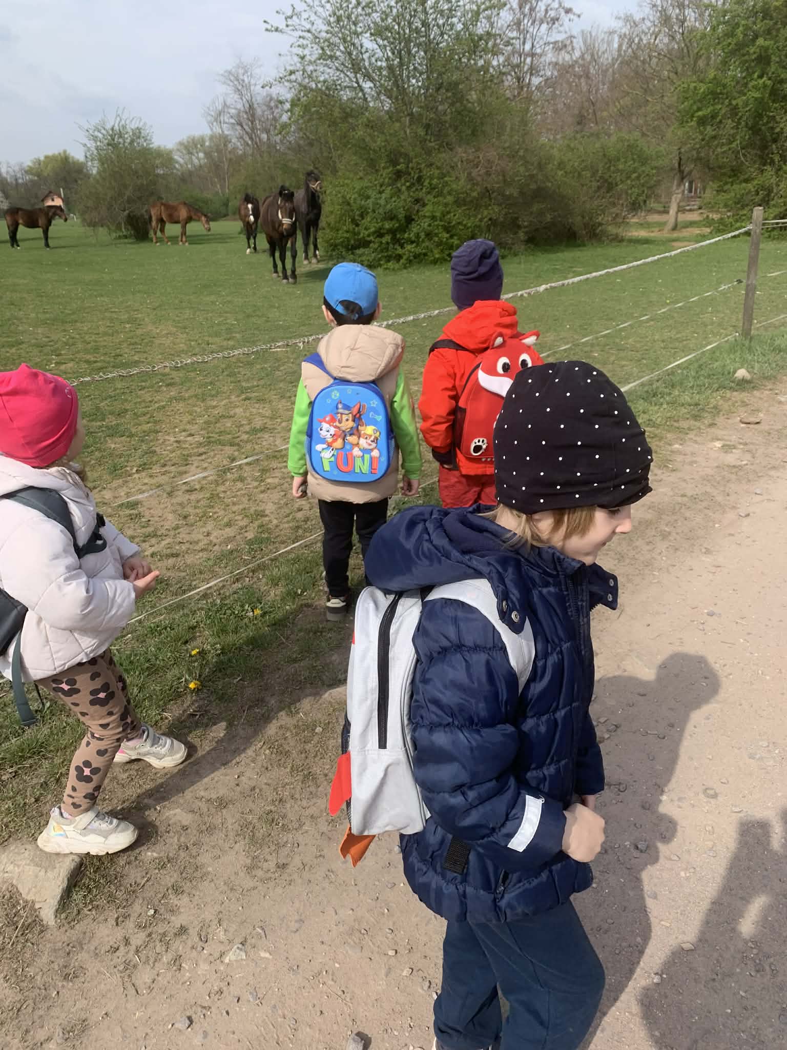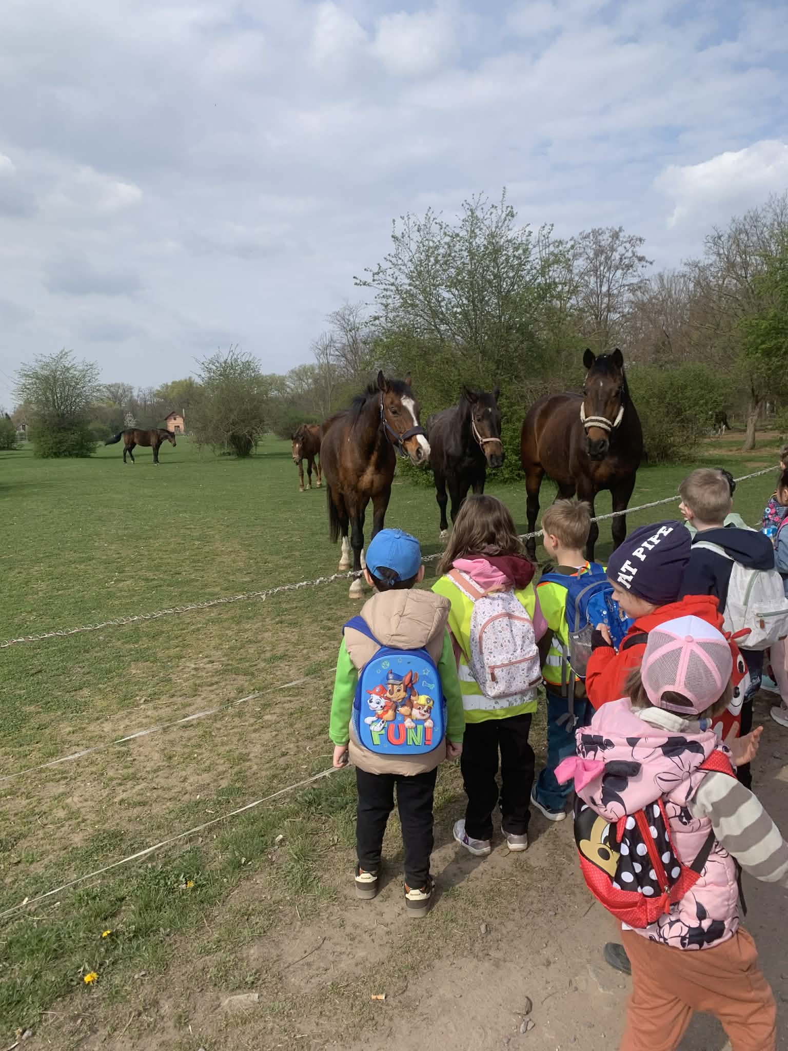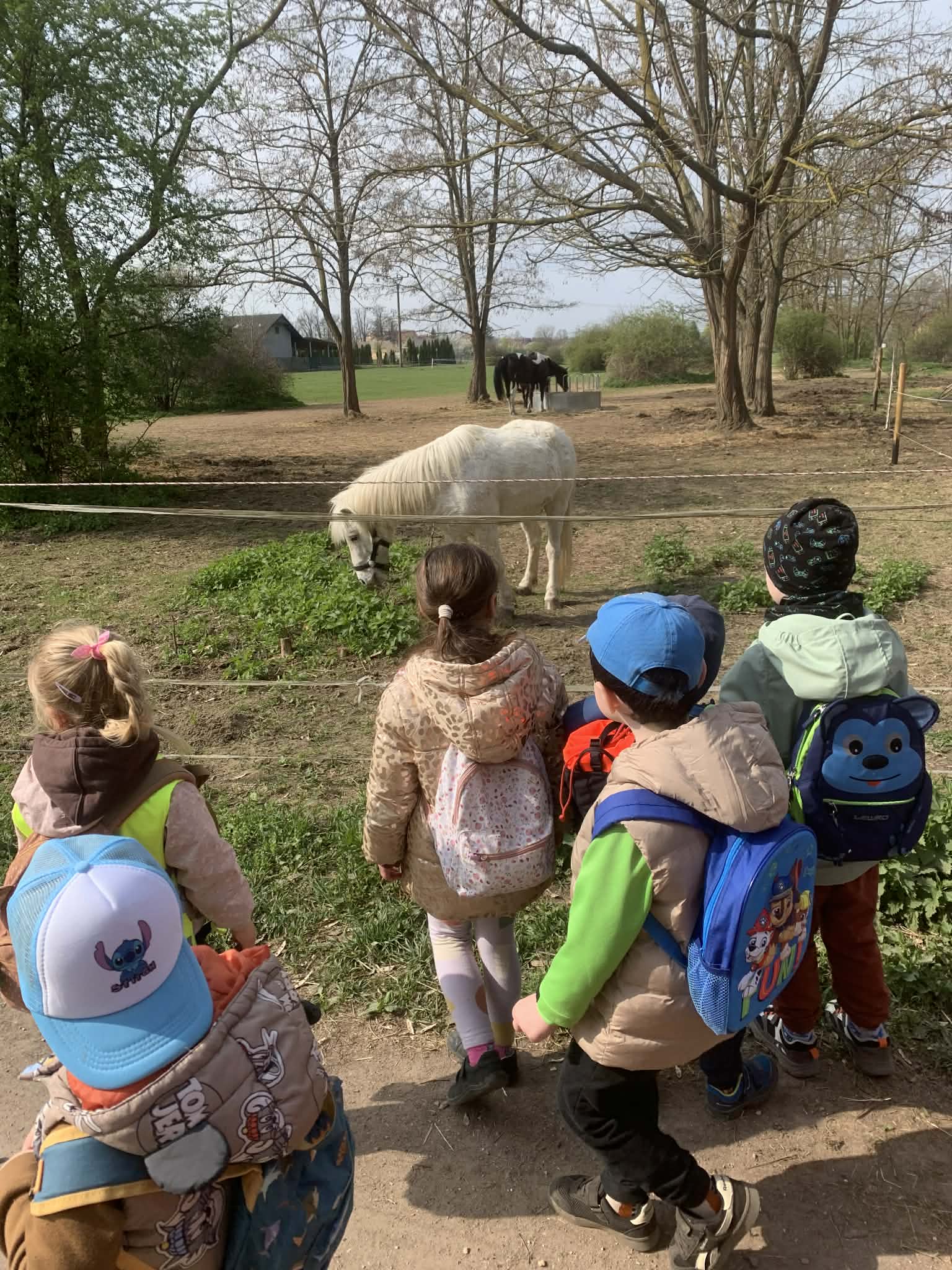 Děti se dnes vydaly na pěší vycházku do obce Pšice, kde jsme v rámci tématu týdne Farma navštívili ohradu s koňmi. Děti měly možnost pozorovat malé poníky i velké koně, povídali jsme si o jejich životě na farmě a o tom, jak se o koně pečuje. Vycházka dětem přinesla přímý zážitek z kontaktu se zvířaty, rozvíjela jejich poznávání světa kolem sebe, pozorovací schopnosti a vztah k přírodě i zvířatům.