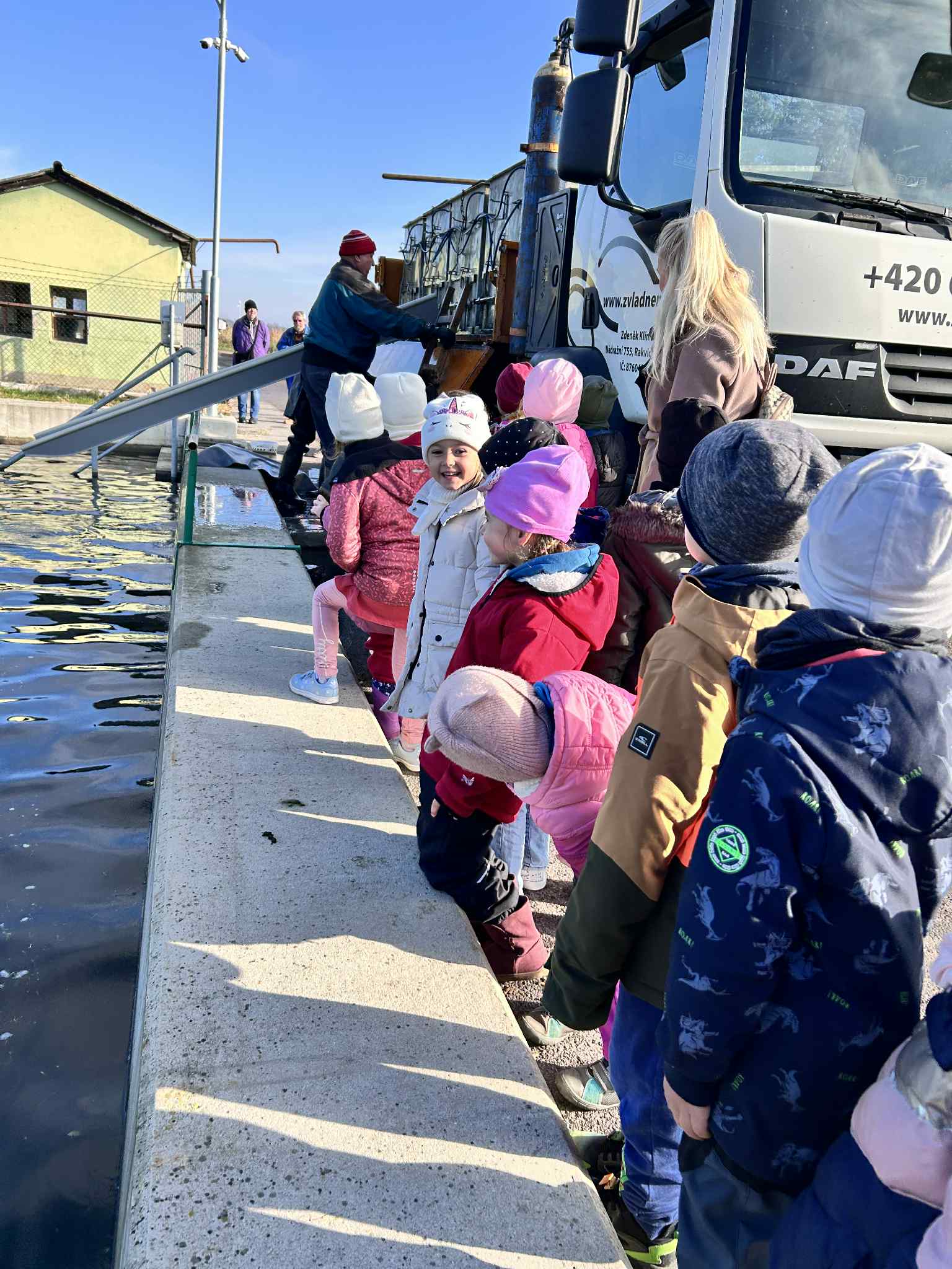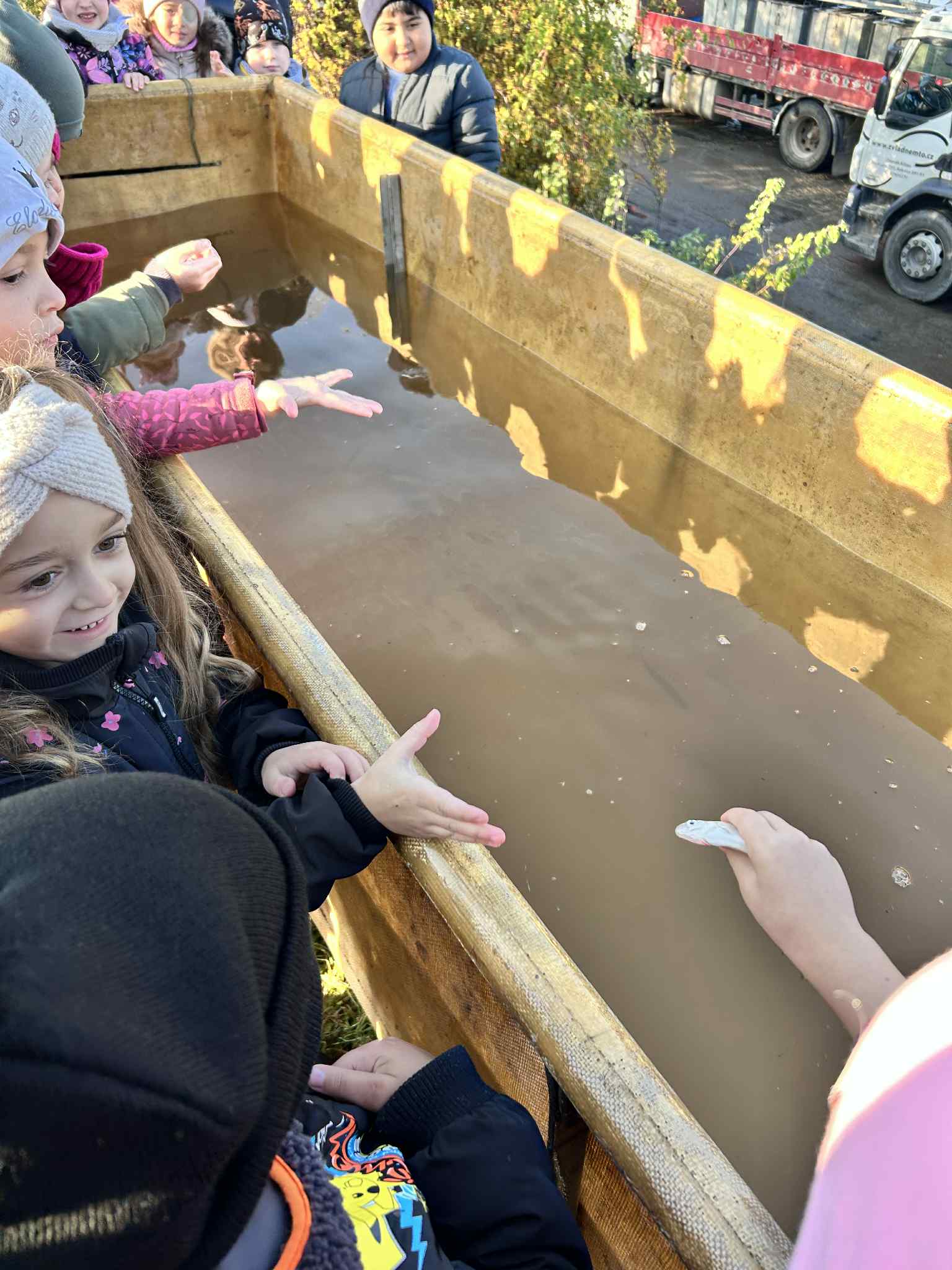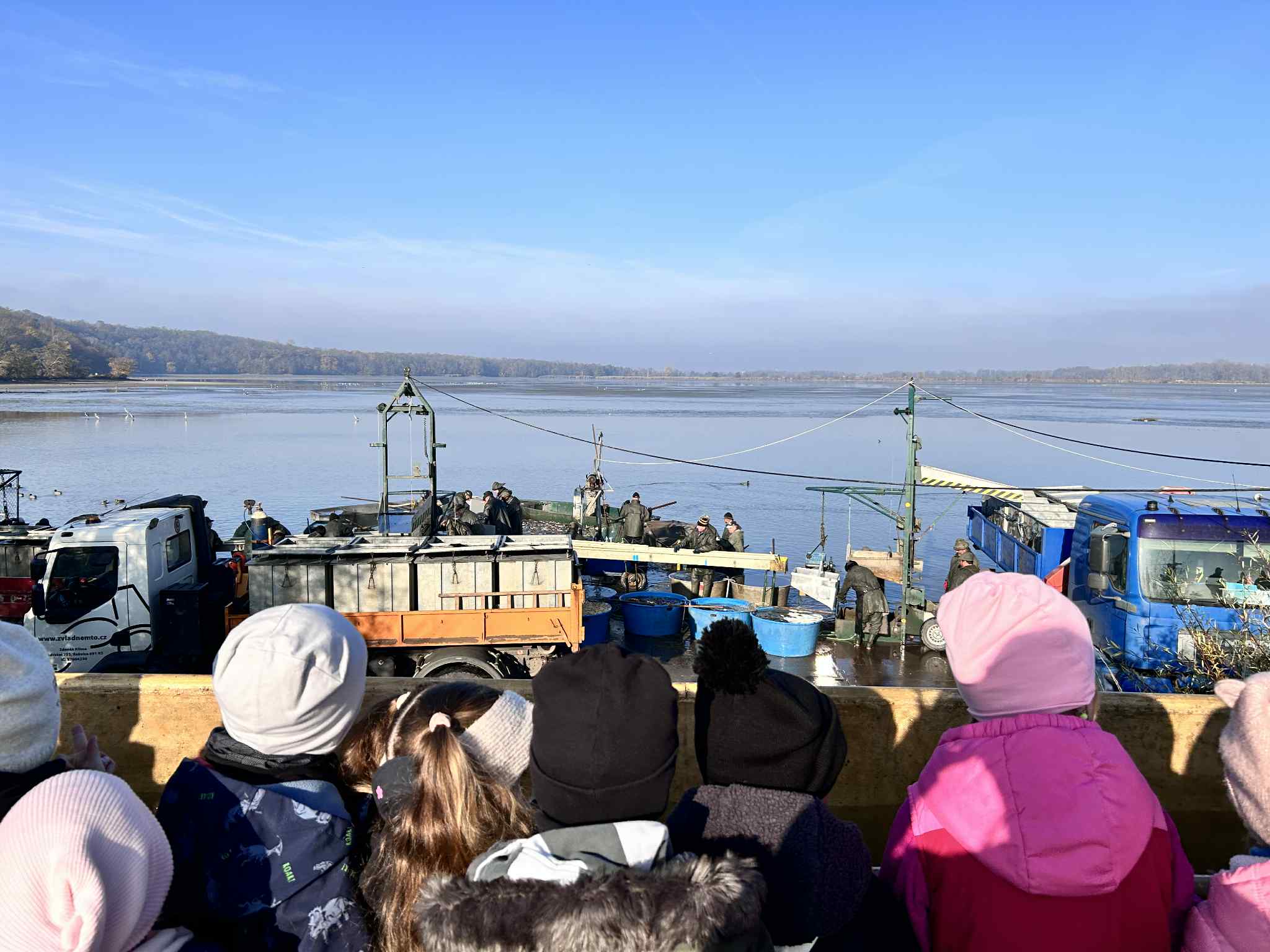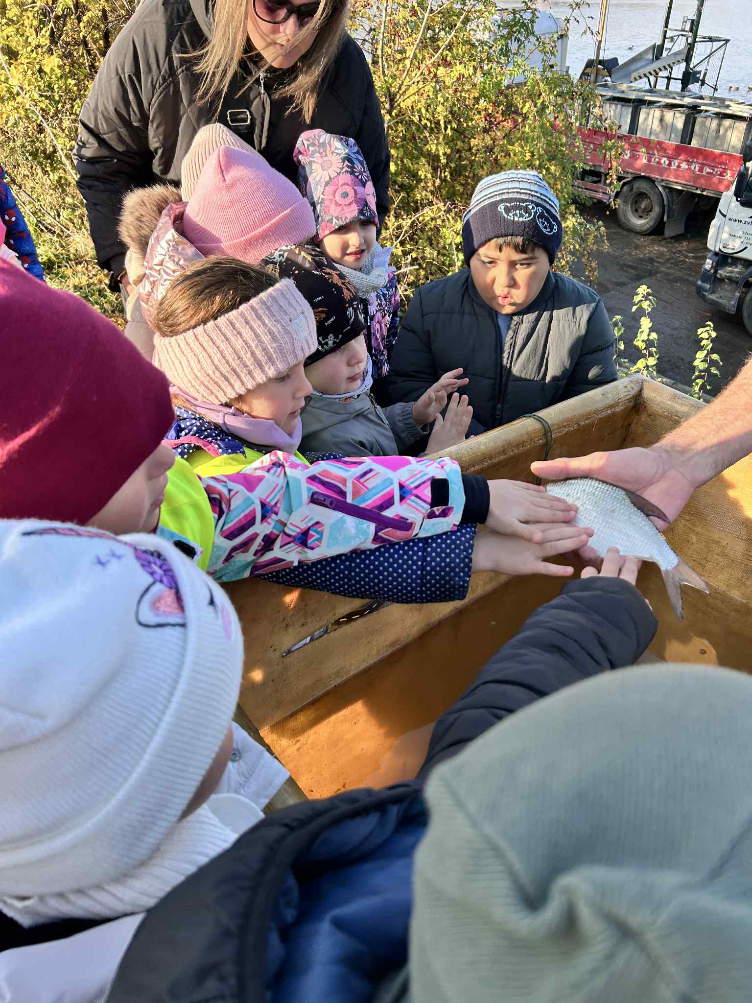 Na výlov rybníka v Jaroslavicích se dnes vydali naši předškoláci. Pan rybář dětem ukázal různé druhy ryb – viděli kapry, štiky, cejny i amúry 🐠. Děti si zblízka prohlédly sítě plné ryb a dozvěděly se, jak výlov probíhá a co všechno rybáři při práci potřebují. 🌊
